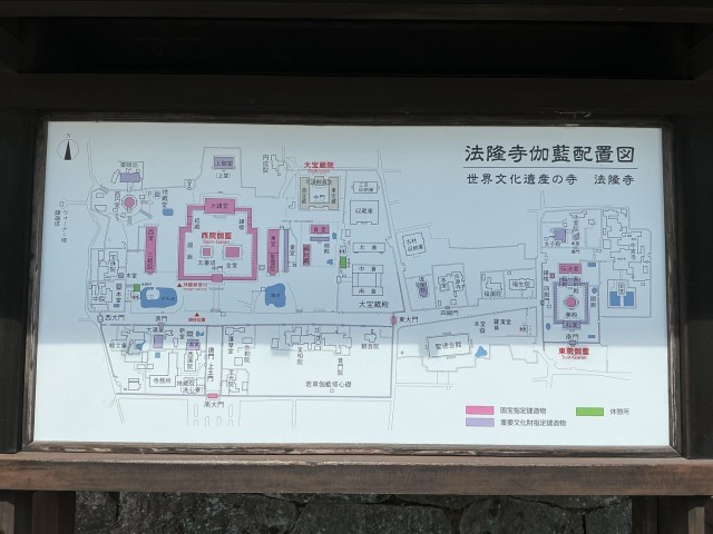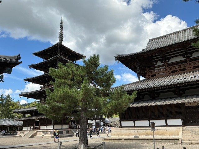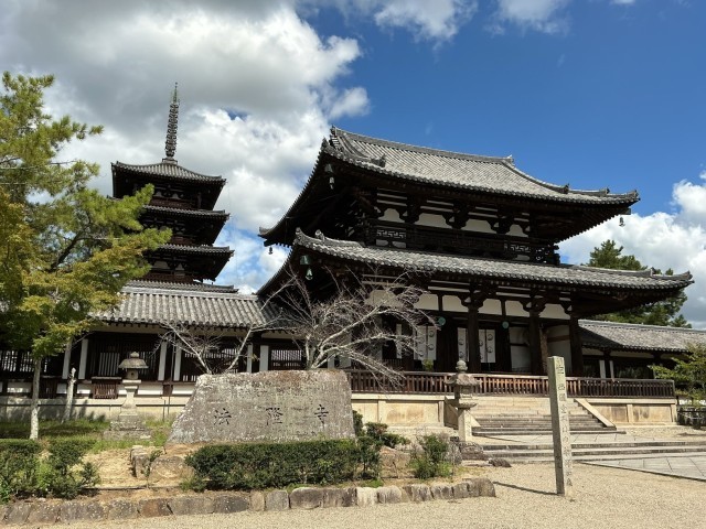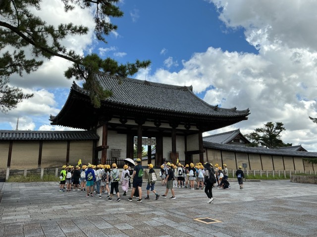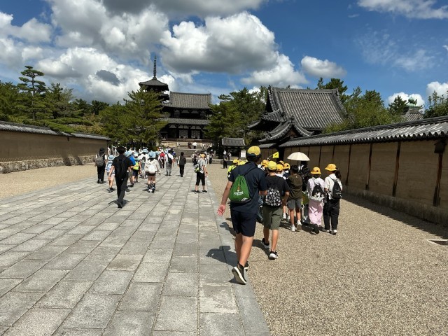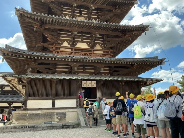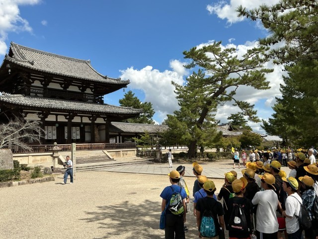 バスガイドさんの説明を受けながら、世界最古、日本一古い木造建築のお寺を見学しています。