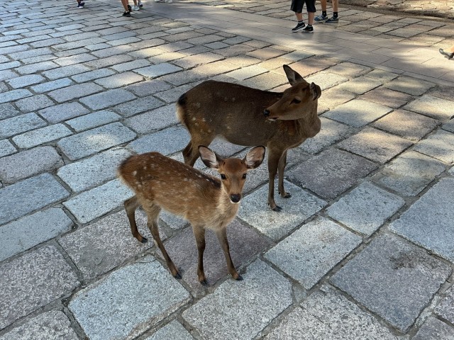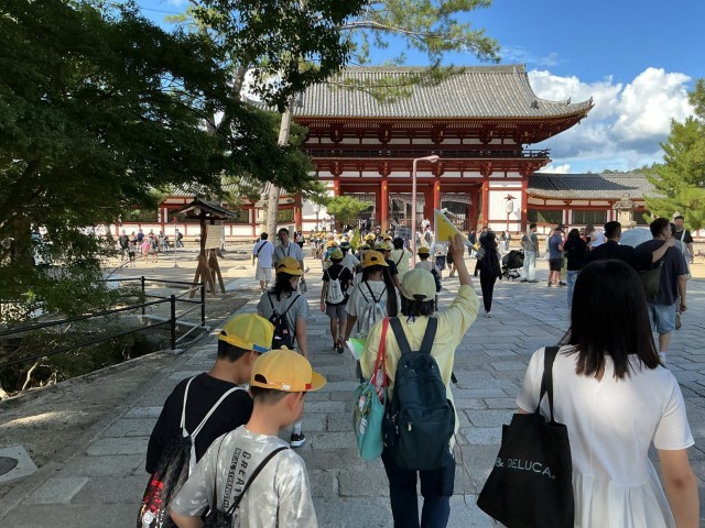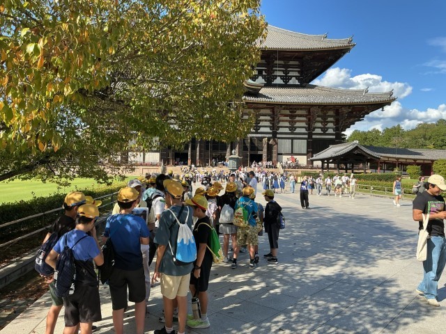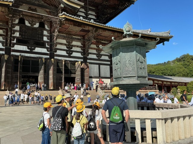 【修学旅行】東大寺大仏殿見学&奈良公園分散研修 公開日 2025/09/30 更新日 2025/09/30 6年 ボランティアガイドさんたちの説明を受けながら、東大寺大仏殿見学と奈良公園分散研修を行っています。目の前に鎮座する大きな大仏様を見て感嘆の声を上げたり、間近にいる鹿が寄ってきたときに腰が引けてしまった子や積極的に鹿せんべいをあげる子がいたりと、子どもたちのさまざまな表情や反応が見られました。 +4 6年生