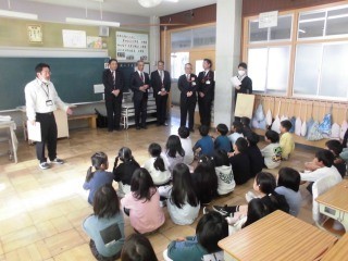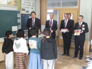 今日は、いろいろな郵便局の局長さんたちが見学に来てくれ、児童へのプレゼントとして本を届けてくださいました。