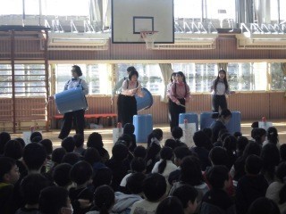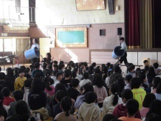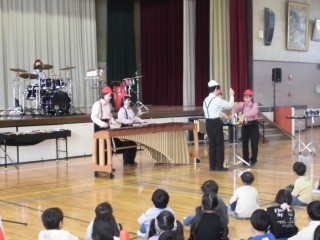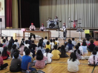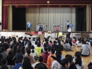 “パーカッションアンサンブルTUTTI!”さんに来校していただき、体育館にて、2時間目に1・2・3年生が、3時間目に4・5・6年生が鑑賞教室を行いました。
