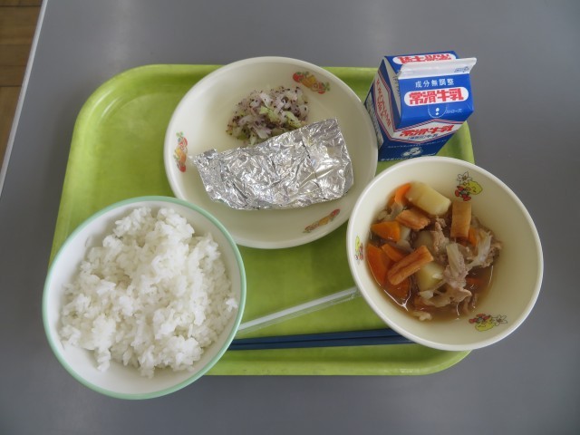 牛乳、ごはん、さばの銀紙焼き、じゃがいものうま煮、ゆかりあえ