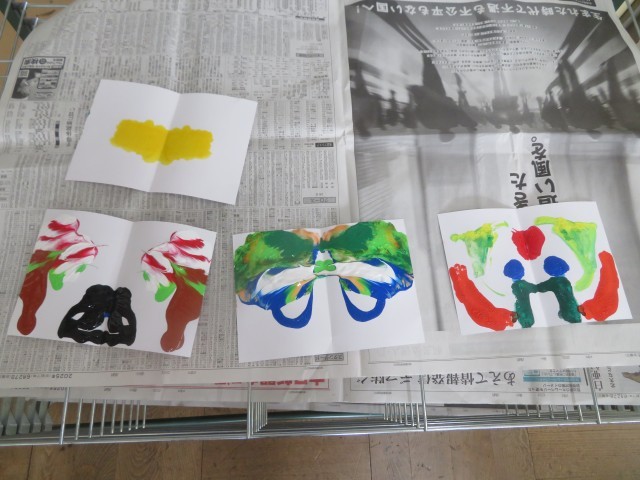 絵の具のサンドイッチ ①半分に折って ②絵の具を半分のスペースにぬって ③折ってこすって