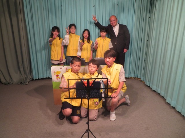 朝会の最後は、児童会役員による「オブショーじゃんけん」です。「役員の皆さん(チョキ)に勝った人?」