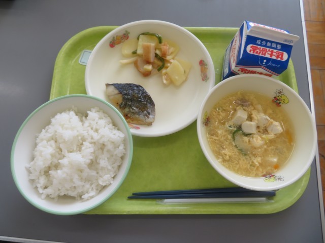 令和8年4月20日(月)本日の給食 公開日 2026/04/20 更新日 2026/04/20 給食 牛乳、ごはん、さわらの香味だれかけ、たけのことジャガイモのきんぴら、かきたま汁おいしい給食!明日から1年生も給食開始。カレーライスですよ! 給食