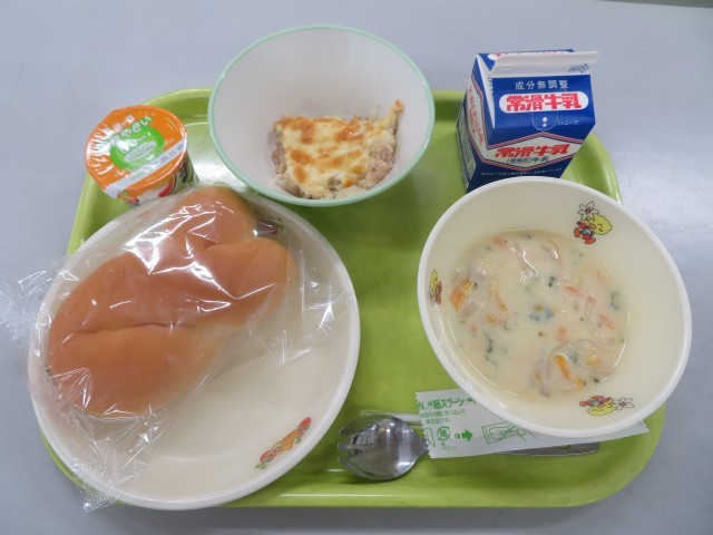 牛乳、クロスロールパン、ツナとポテトのチーズ焼き、豆乳コーンポタージュ、野菜ゼリー
