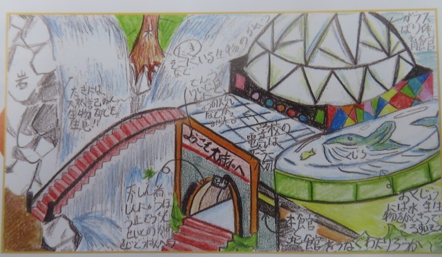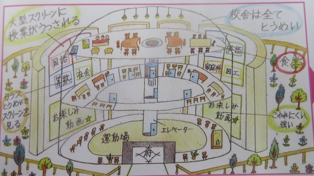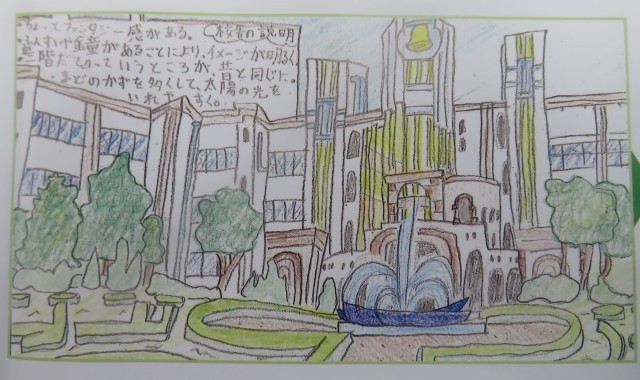 令和4年度、開校150周年時の6年生が描いた「未来の大府小学校校舎」の最終回です。(児童の思い)「私は、この校舎に『いつまでも明るくきれいな学校で過ごせたらいいな・・・。』という思いを込めて描きました。木や草原などの緑を入れると、涼しげな感じを出せて、自然に囲まれた今の大府小のイメージを残せました。」