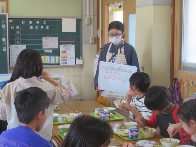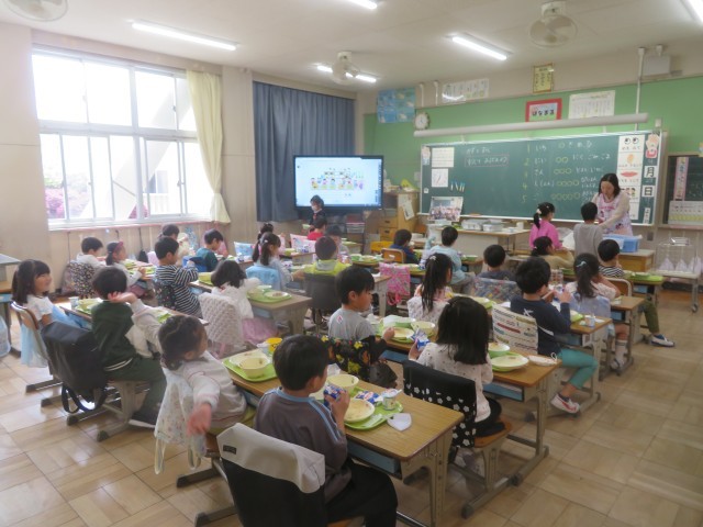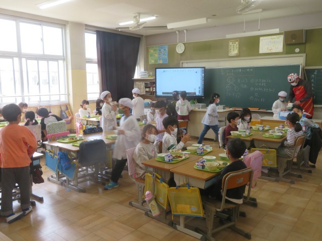 給食準備中は、栄養教諭の先生が各クラスを巡回しています。今日は、ホワイドボードを首にかけ、教室をまわって1ました。