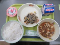 牛乳、ごはん、マーボー豆腐、ひじきと春雨の中華あえ、お祝いデザート「お祝いデザー...