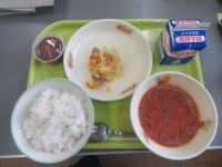牛乳、むぎごはん、焼きウインナー、カレー、ツナサラダ(写真は職員室で配膳されてい...
