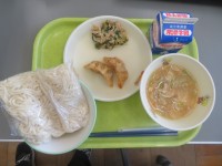 牛乳、ソフトめん、豆乳ちゃんぽんスープ、揚げぎょうざ、青菜いためおいしい給食!