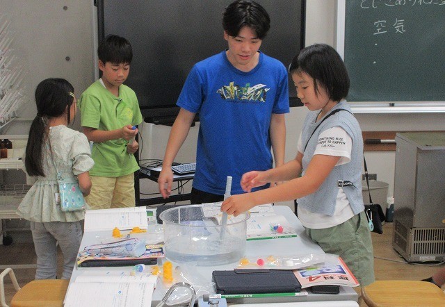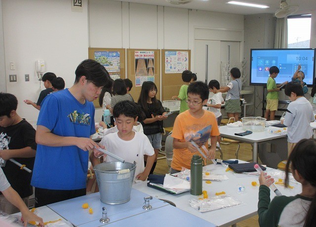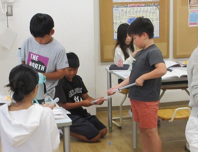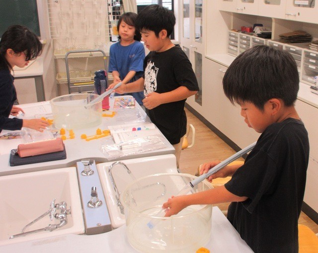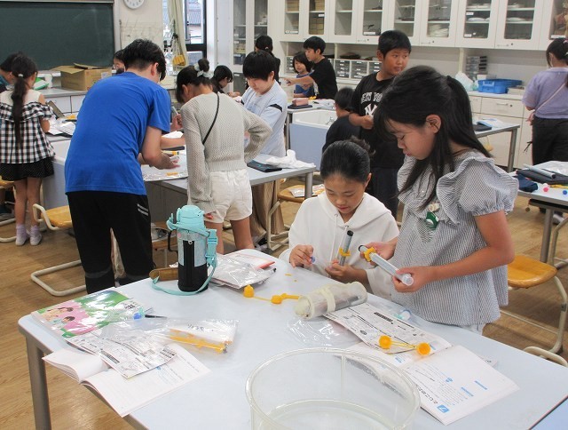 理科 4年 公開日 2025/10/14 更新日 2025/10/14 4年 4年生が理科で水鉄砲や空気鉄砲を使って「閉じ込められた水と空気」の性質を調べていました。玉の飛び方や注射器の縮まり方から水と空気の性質をまとめました。空気鉄砲はポンポンと音が出て、実験も楽しそうでした。 +3 4年生