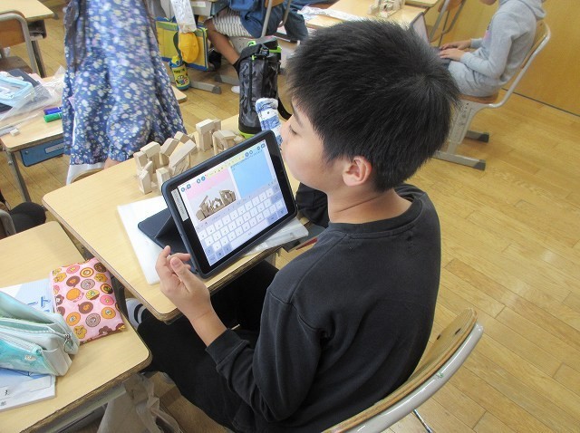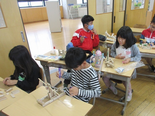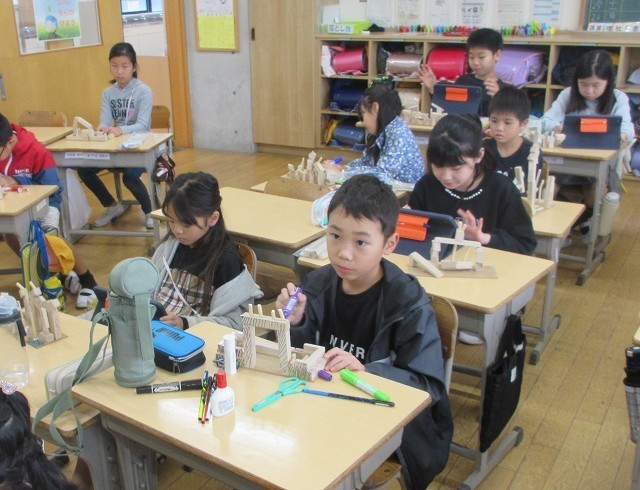 図画工作 4年 公開日 2025/10/22 更新日 2025/10/22 4年 4年生が図工で「のこぎりギコギコ」の作品作りをしました。木を小さく切っていましたが、それを削ったり、磨いたりして作品を作りました。組み立てたものに色をつけて仕上げていました。タブレットでも撮影し、まとめていました。自分だけの作品ができあがりましたね。 +2 4年生