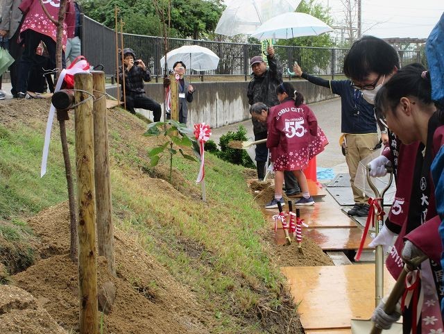 市長さんが挨拶の中で、市制55周年を記念してサクラやアオギリ、ツツジを植樹することを説明されました。