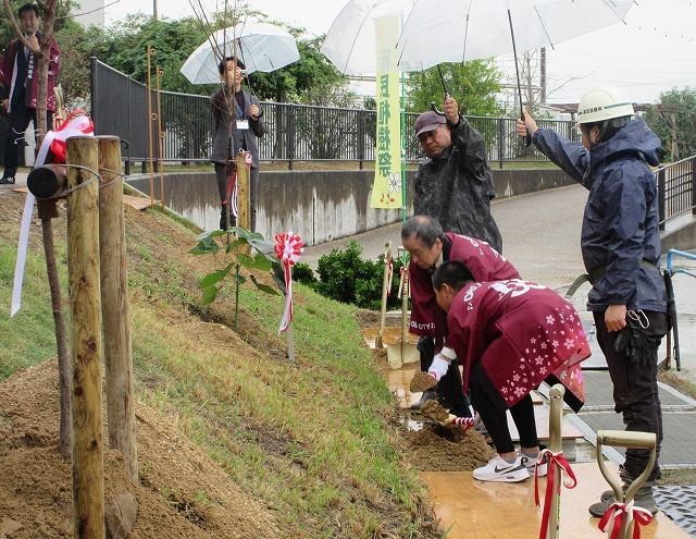 外に出て、来賓の方と一緒に、運動場の土手にサクラ4本とアオギリ1本を植樹しました。