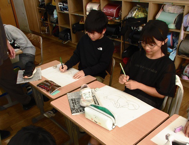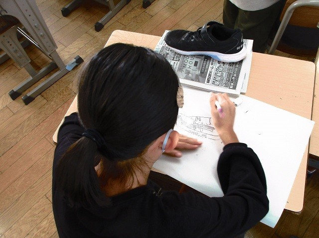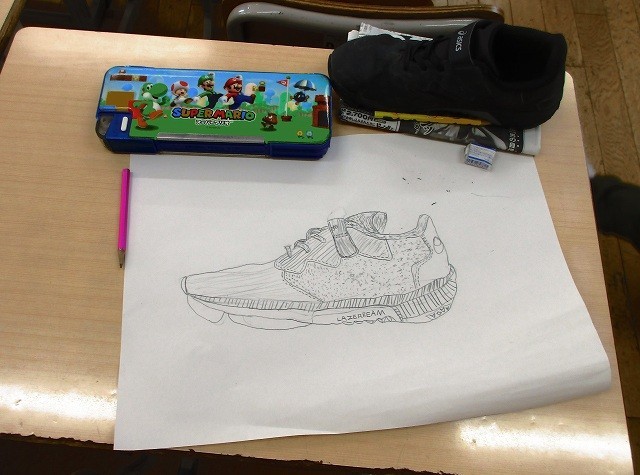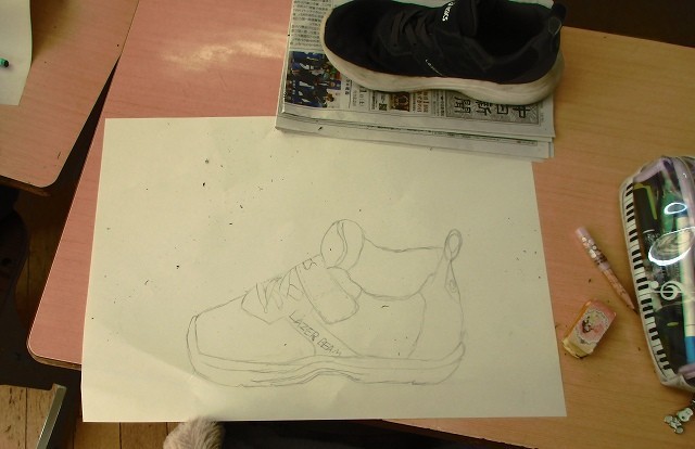 図工 4年 公開日 2025/11/17 更新日 2025/11/17 4年 4年生が図工でくつのスケッチをしていました。自分の靴をよく見て、細かいところまでスケッチしました。うまく形も整えたり、ひもの部分もどのようになっているのかよく見たりして描くのが難しいようでした。自信作はできましたか。 +4 4年生