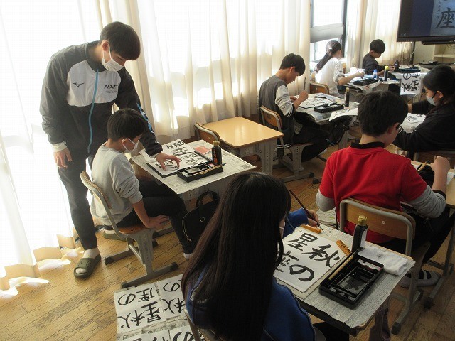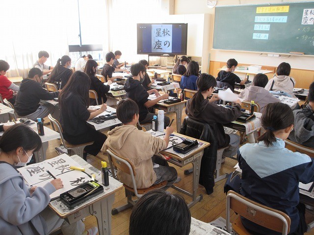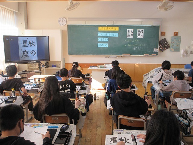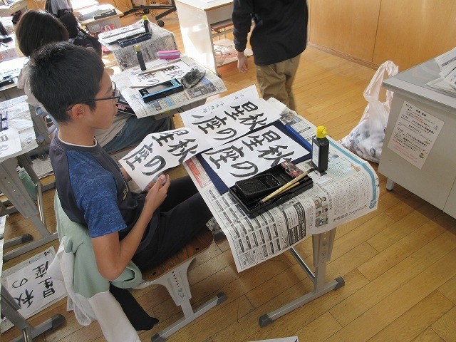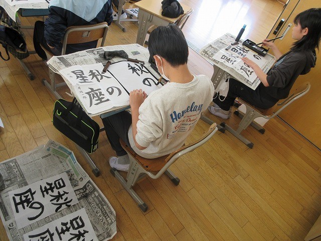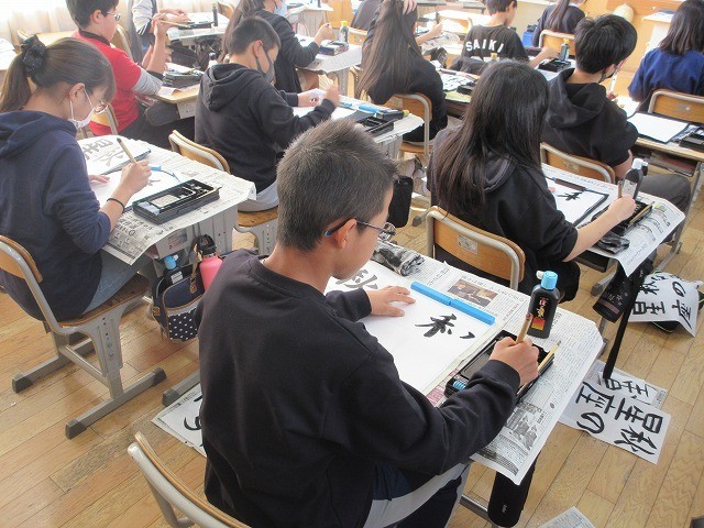 6年生が校内書写コンクールの作品を書いていました。