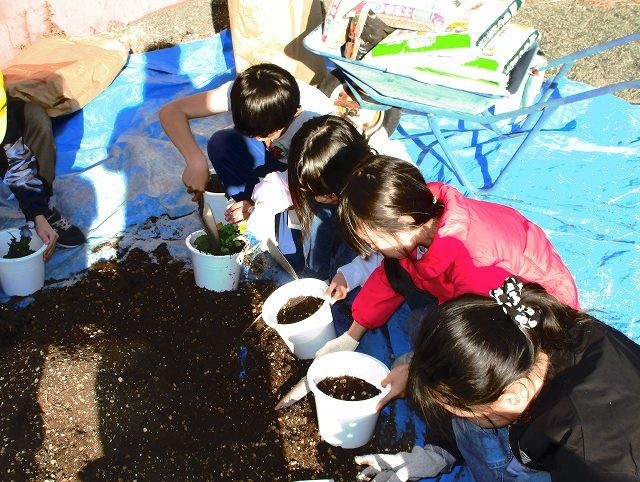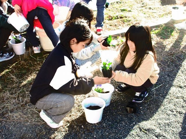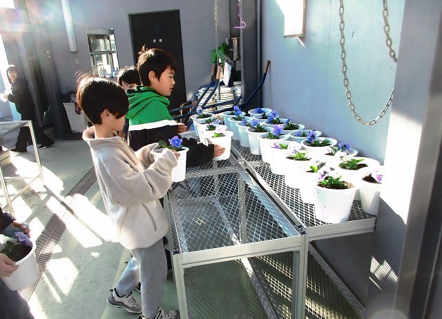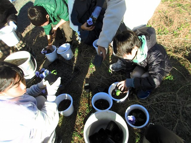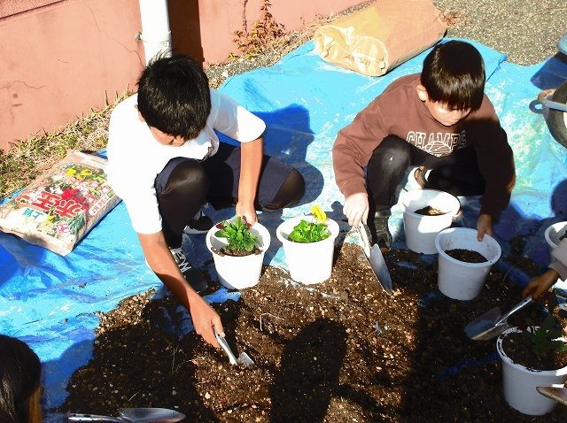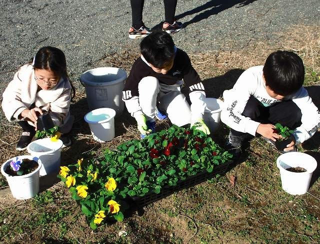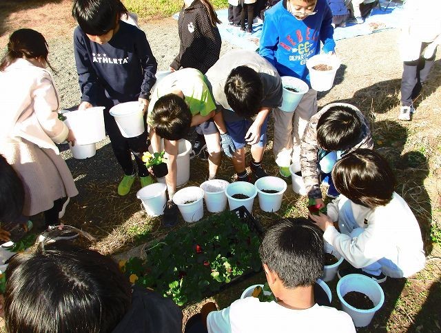 パンジーの鉢植え 4年 公開日 2025/12/09 更新日 2025/12/09 4年 4年生がパンジーの植え替えをしました。苗ポットで栽培されたパンジーを少し大きい鉢に植え替えました。こうすることによって苗自体が大きくなり、大きくてきれいな花を咲かせます。植え替えたものは温室に入れて育てます。年度末には卒業式、そして来年度の入学式に使われるようになります。生長を見守りましょう。 +4 4年生