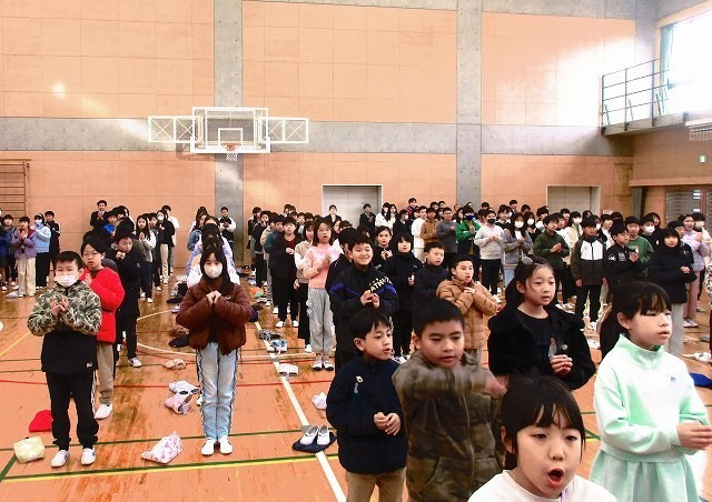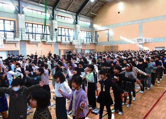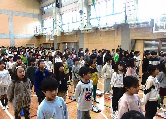 尾張書写コンクールの表彰の後、全校合唱を行いました。