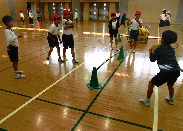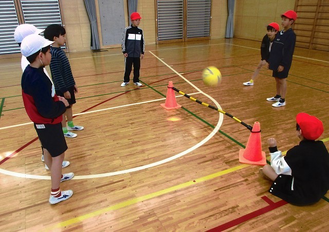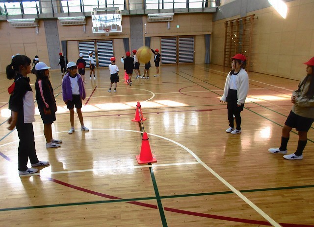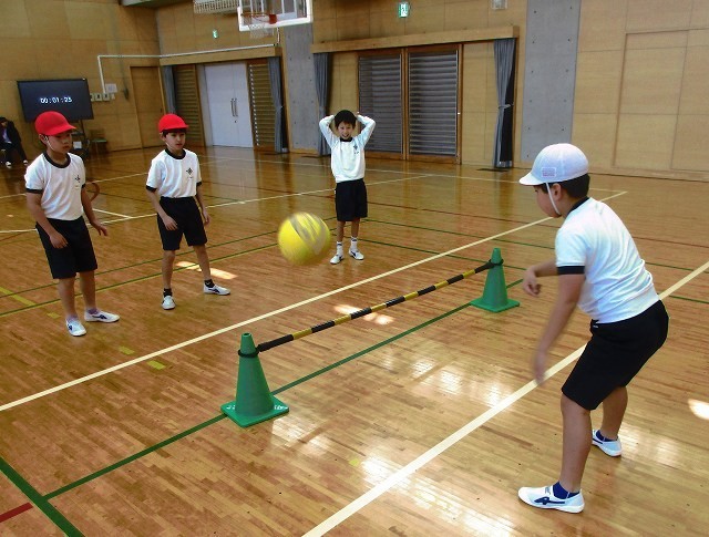 体育館でコートをつくり、バウンドさせたボールをつないだりキャッチしたりして相手コートに返して続けるゲームです。