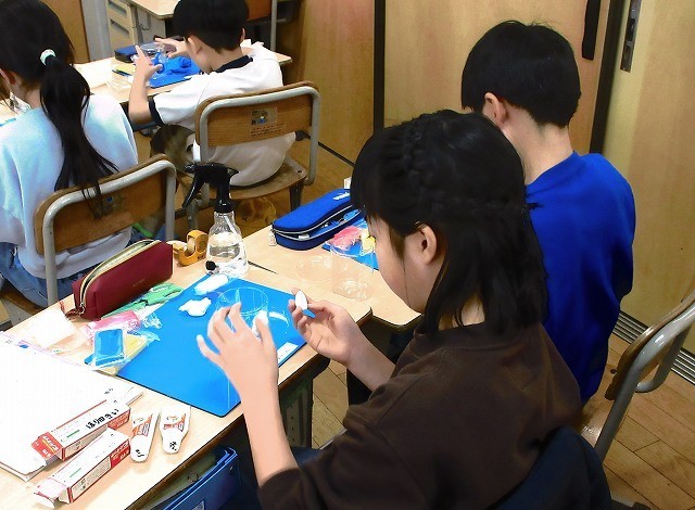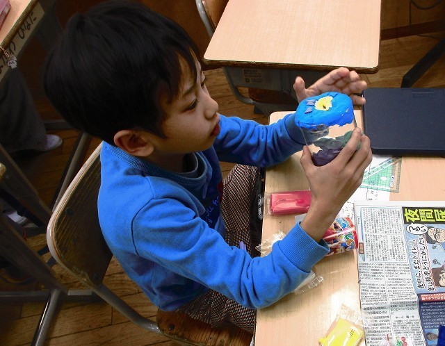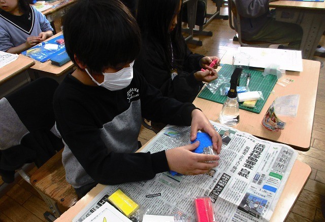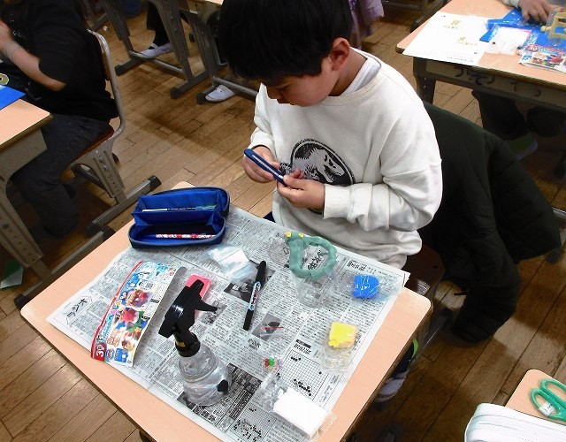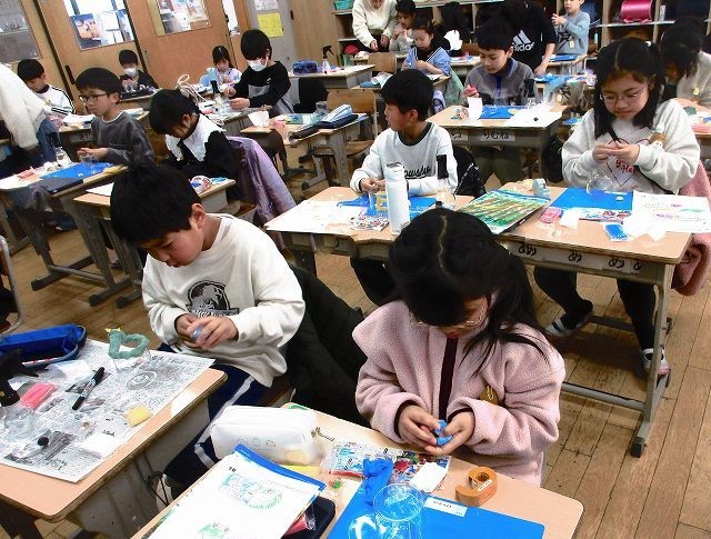 図画工作 3年 公開日 2026/01/23 更新日 2026/01/23 3年 3年生が図工で作品を作っていました。色つきの紙粘土で絵を作り瓶に貼っていきます。みんな集中して作っていました。カラフルできれいな絵や模様ができたようです。 +5 3年生