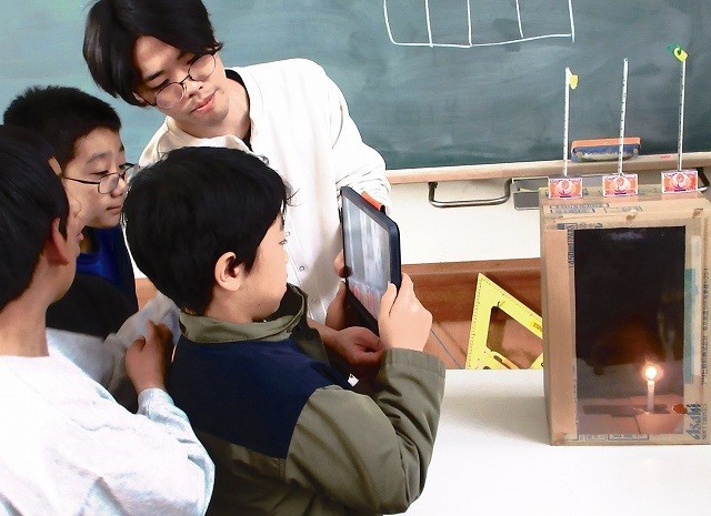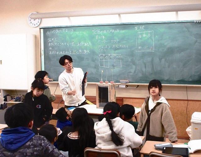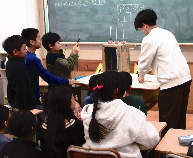 理科 4年 公開日 2026/01/23 更新日 2026/01/23 4年 4年生が理科でもののあたたまり方を実験していました。箱の中でろうそくを燃やして中の温度を測っていました。みんなで直接見たり、それをタブレットで中継しテレビモニターで観察したりしていました。実験結果から何がわかったのでしょうか。 +3 4年生