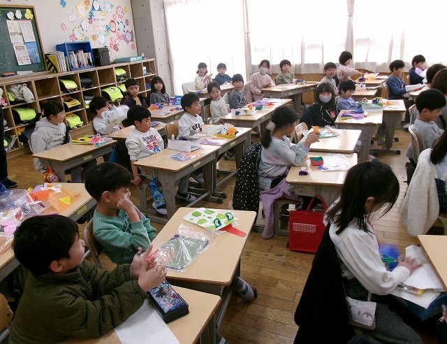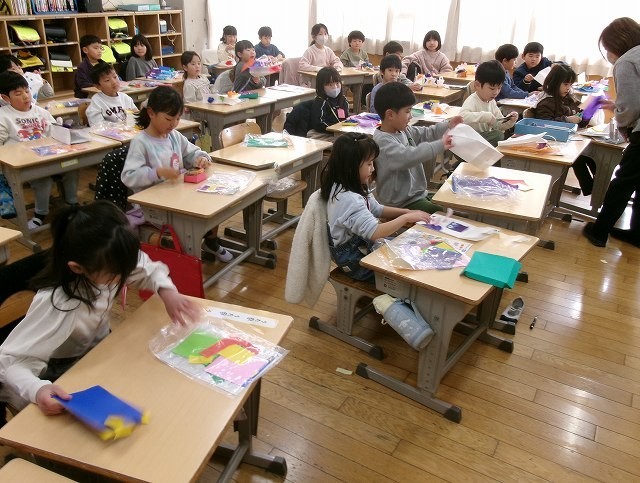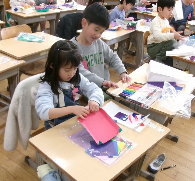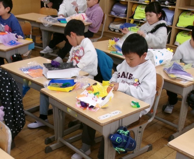 1年生が図工でつくった作品を使って遊んでいました。