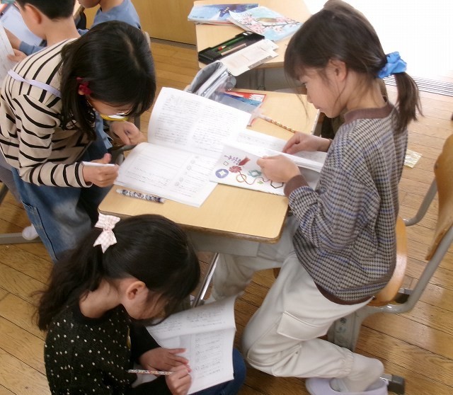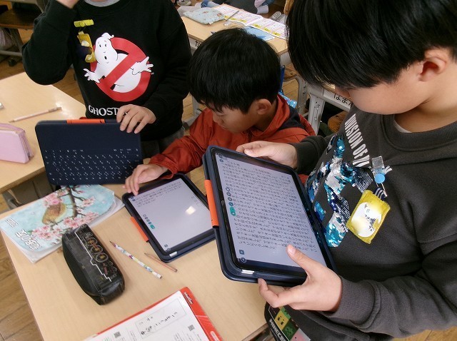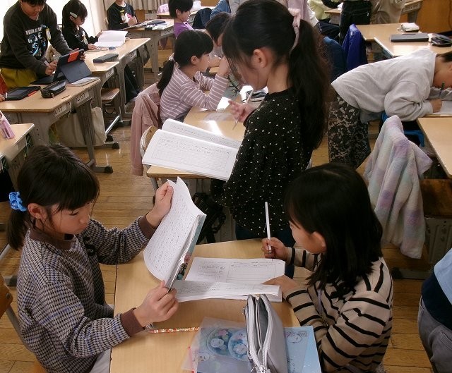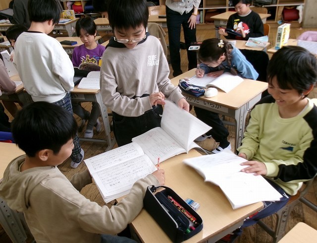 国語 3年 公開日 2026/02/24 更新日 2026/02/24 3年 3年生が国語の「たから島のぼうけん」という単元で、物語を書きました。それぞれが書いた自分だけの物語です。その物語を二人か三人のグループで、お互いに読み合いました。そして、その感想を聞きました。みんな真剣に、そして楽しそうに読んでいました。友達が書いた物語を書いたり読んだりする機会はなかなかありません。大切にとっておきましょう。 +5 3年生