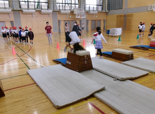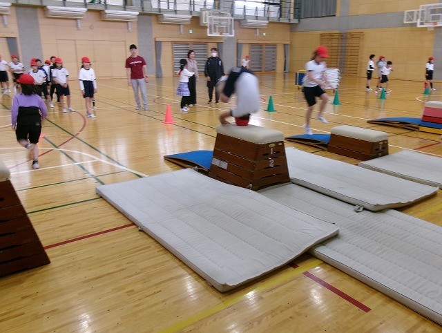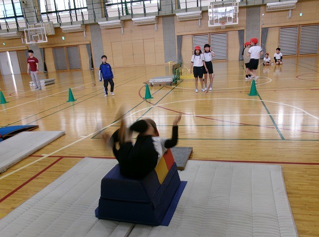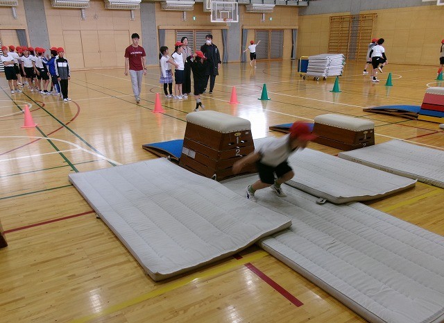 跳び箱が苦手な子はマットを丸めたものや、柔らかい素材の跳び箱で練習しました。