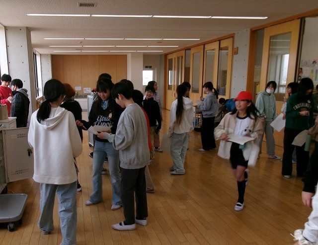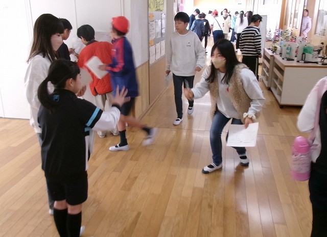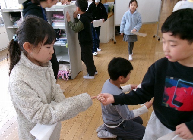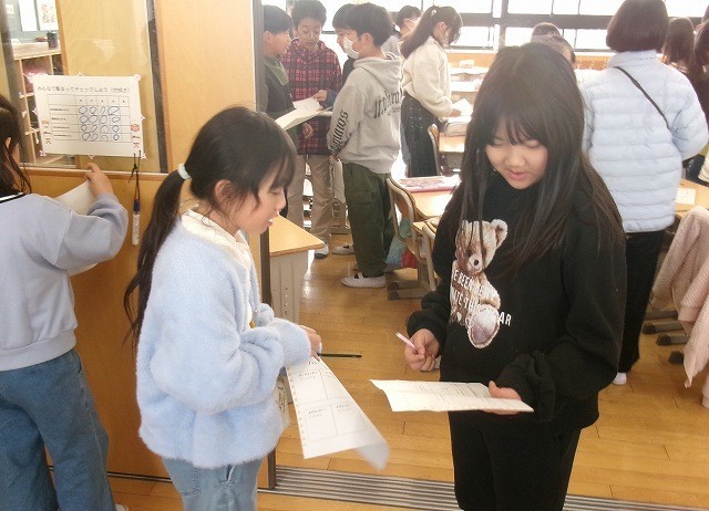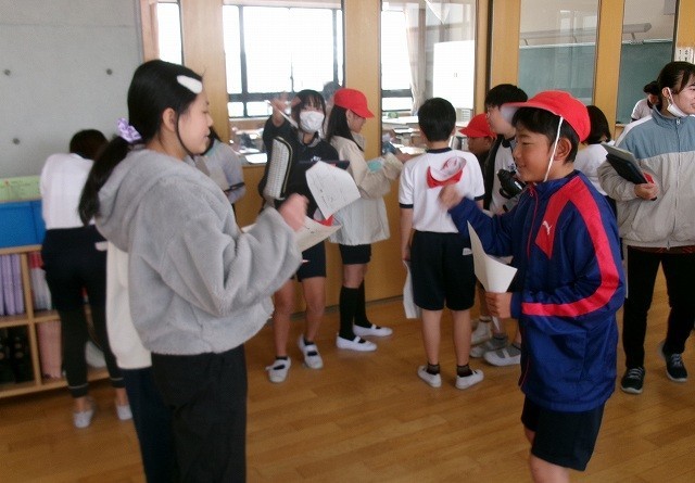 じゃんけん大会 公開日 2026/03/13 更新日 2026/03/13 お知らせ 1時間目の放課と2時間目の放課にじゃんけん大会がありました。総務委員会の企画で3年対4年、5年対6年で行いました。じゃんけんで勝った方が相手からサインがもらえます。同じ学年の男女と違う学年の男女それぞれ2人ずつの合計8人のサインをもらうと賞状がもらえます。みんなたのしくじゃんけんを楽しんでいました。楽しい企画をありがとうございました。 +6 お知らせ