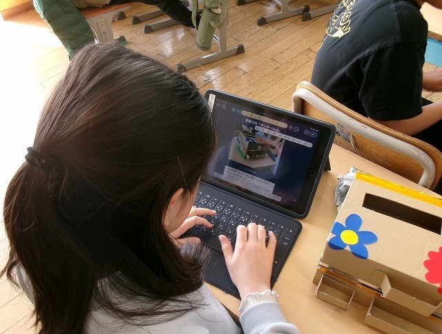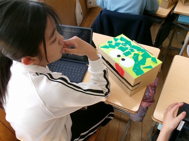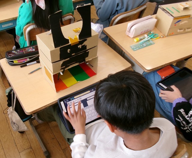 図画工作 4年 公開日 2026/03/17 更新日 2026/03/17 4年 4年生が図工で作った作品の鑑賞をしていました。作品はダンボールブロックです。箱をアイデアに沿って飾り付けしていました。それらを写真に撮り、感想をタブレットに打ち込んでいました。作品のよいところなどを味わうことができました。 +3 4年生