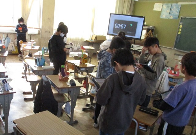 5年生の図画工作では、ちょうど作品の鑑賞会をしていたので、一緒に立体作品を見ることができました。作品の中のストーリー性や世界観が感じられる力作が並んでいました。