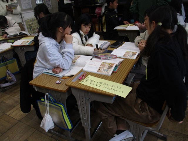 最後の写真は6年生の国語で、物語から読み取ったことを話し合っている場面です。グループの中で「自分も同じ考えだった」「もう少し付け加えたい」「そういう見方に気付いて、すごいね」など意見を交流して、自分で考えていたことが、より深まっていきました。