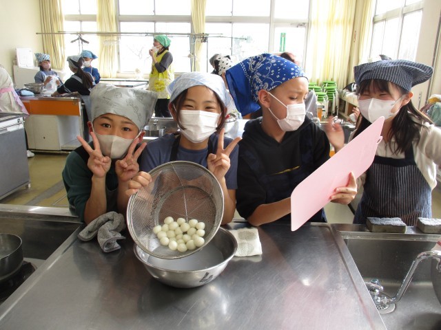 後半2枚の写真は、今日の午後にお団子作りをした3年生の様子です。つるんつるんのおいしそうな団子が出来上がりました。
