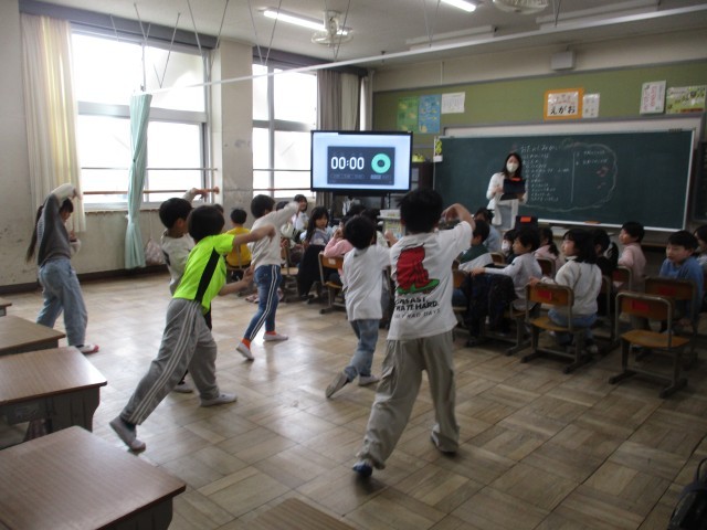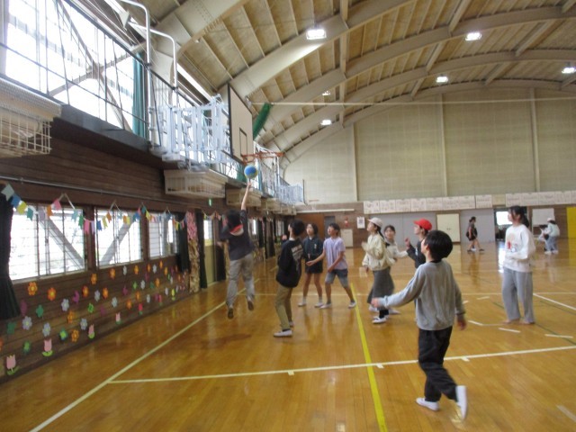 今日は、それぞれの学級で「学年末お楽しみ会」が開かれていました。写真は運動場、体育館、教室でのお楽しみ会の様子です。ボールゲームや出し物の発表で、とても盛り上がっていました。