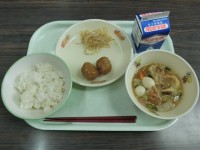 今日の給食はむぎご飯 牛乳レバー入りつくね八宝菜もやしの中華和え エネルギー 5...