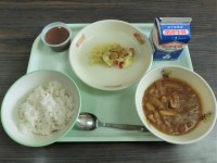 今日の給食はむぎご飯 牛乳カレーカラフル野菜ソテー手作り豆乳ココアプリン エネル...