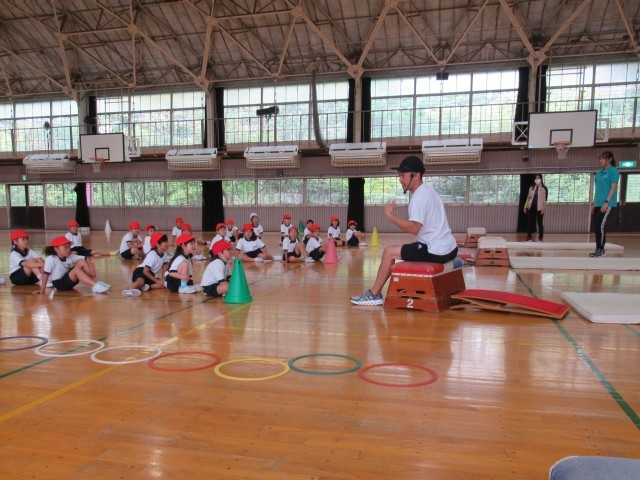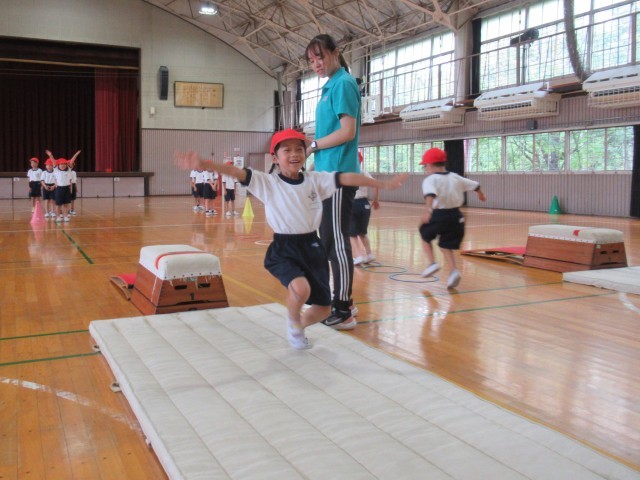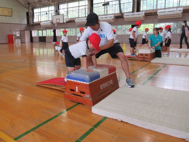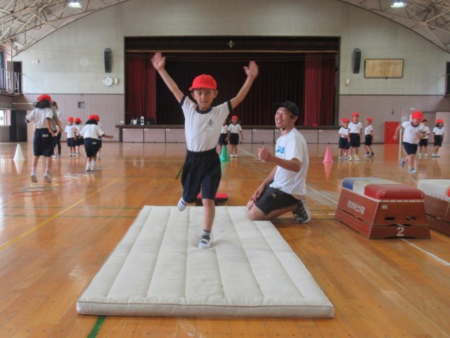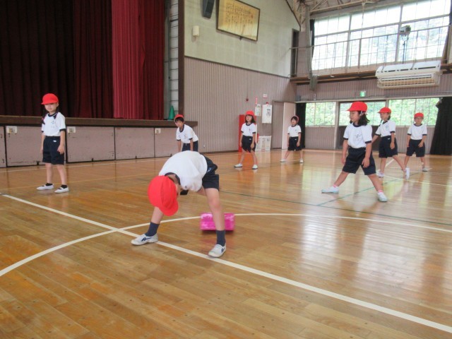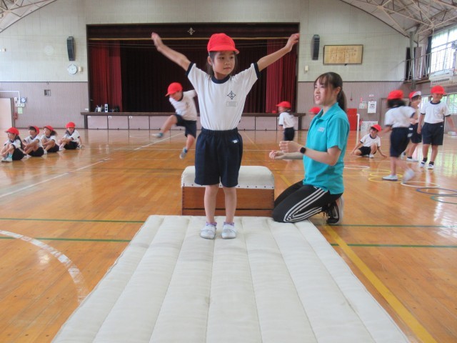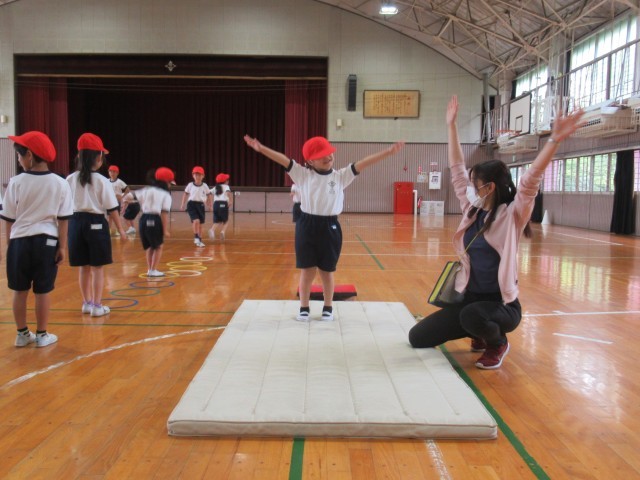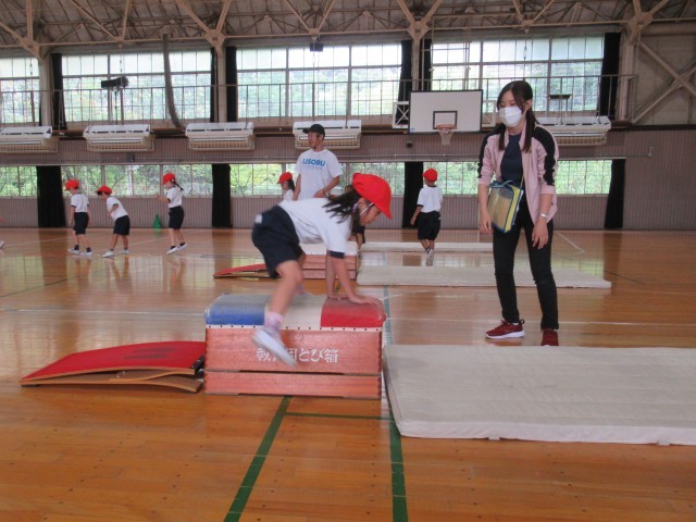 1年生の「はつらつ運動プログラム」は、今日から跳び箱が始まりました。最初に、跳び箱の台上を手で押す感覚を覚えるために手形のついた箱を後ろに送り出す動きを練習しました。(写真2、3枚目)次に、ロイター板を両足で強く踏み切って高く跳び、手を前に出して着地する動きを練習しました。(写真4、5枚目)最後は、講師の先生方の補助を受けながら2段の跳び箱で開脚跳びに初挑戦しました。(写真6~10枚目)「はつらつ運動プログラム」での跳び箱は、今後2回行います。次回は、さらに高く美しく跳び箱を跳ぶことができるようになってほしいと思います。