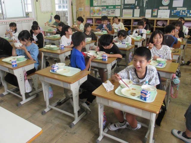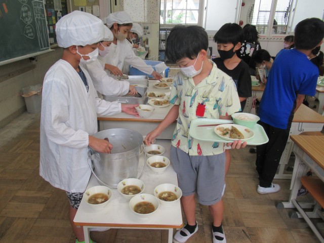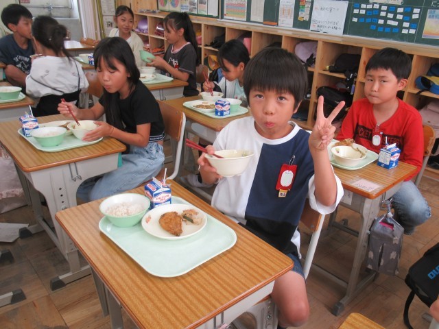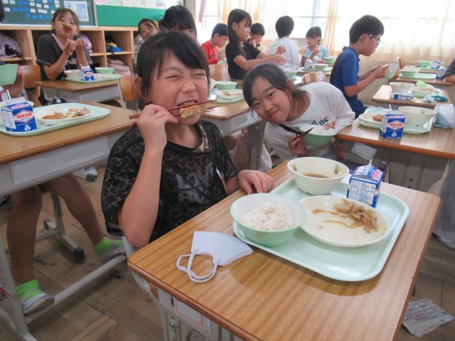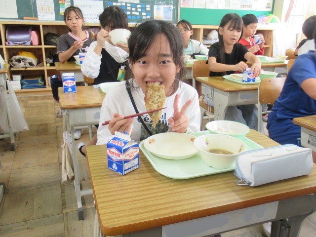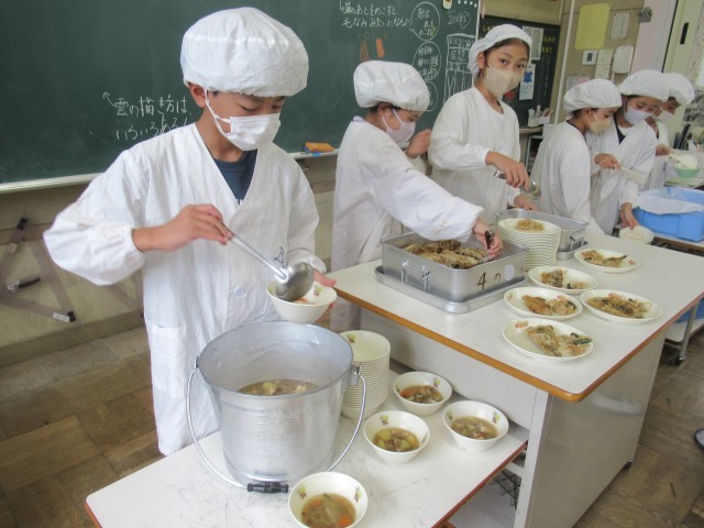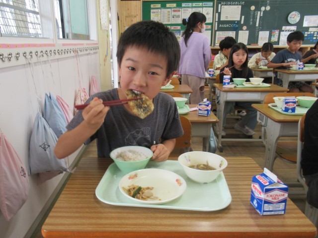 今日は4年生の担任の先生が出張でいなかったため、代理で4年生の給食の時間にお邪魔をしました。先生がいなくても、自分がやるべきことを進んで行い、時間どおり「いただきます」ができました。今日は人気の「いわしの蒲焼き」だったため、豪快に食べるポーズをお願いして写真を撮らせてもらいました。(写真1、5、6枚目)おかずの煮物の余りも、おかわりにたくさん来てくれて完食でした!(写真8、9枚目)