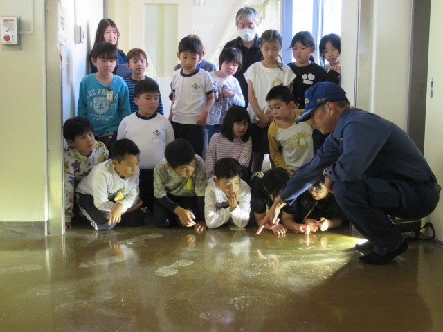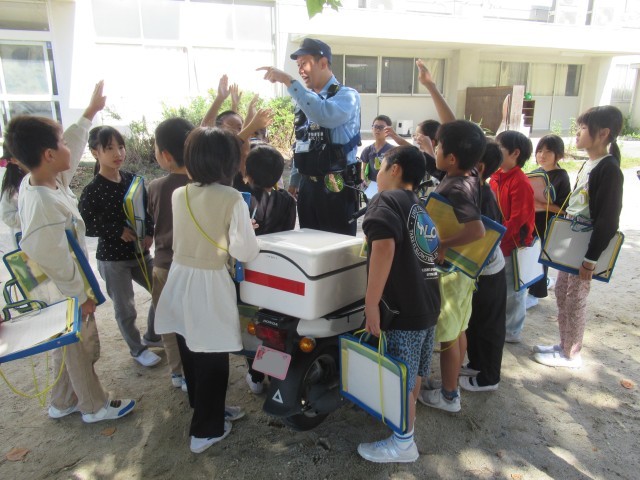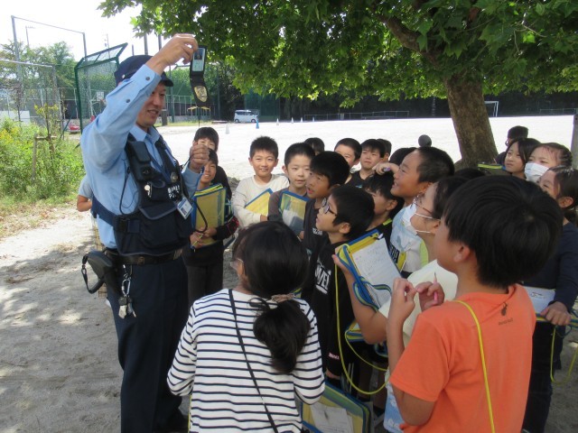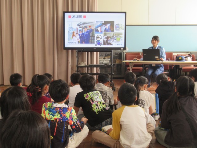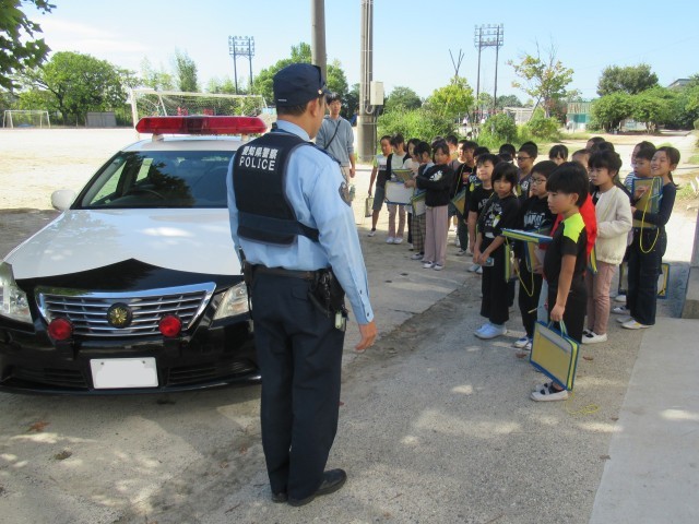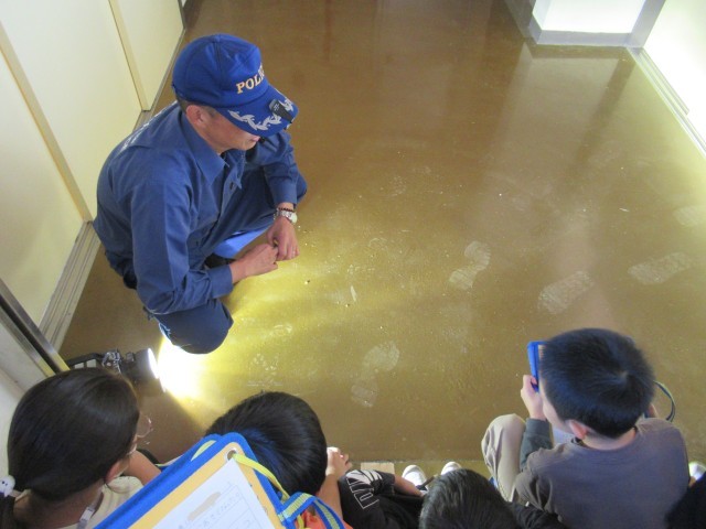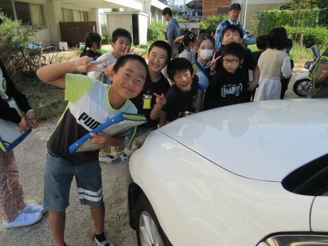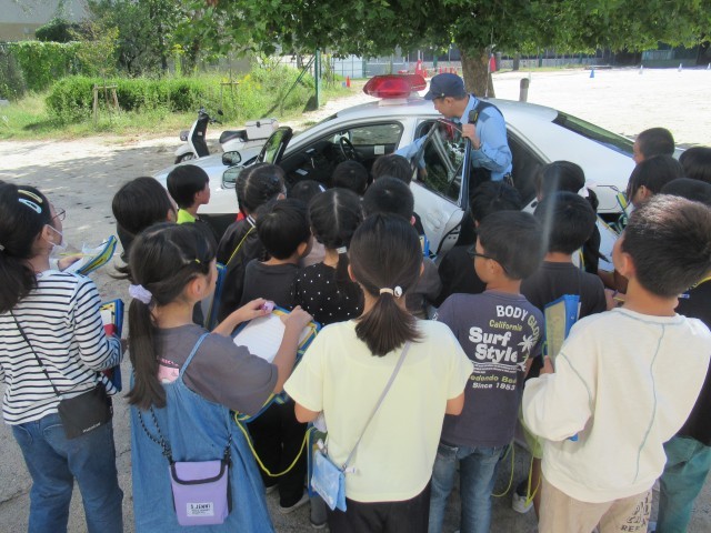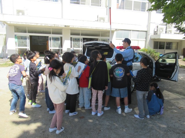 3年生は特別授業「警察出前講座」を行い、警察官の方から「いろんな警察の仕事」についてお話を聞きました。警察署内には「地域部」「生活安全部」「交通部」「刑事部」などのさまざまな部があり、あらゆる事件や事故から私たちの命やお金を守るため、警察が役割を果たしていることを学びました。(写真2、3枚目)この後、鑑識の仕事の一つである「足跡鑑定」を見学しました。(写真4、5枚目)後半は、パトカーの装備を見学したり(写真6~8枚目)、テレビでよく見かける警察手帳(写真1枚目)や手錠を見させていただいたりしました。児童からは「それ本物?」「もっと見せて!」と、警察の方に詰め寄り話しかける姿が見られ、警察の仕事にとても関心がもてた様子でした。