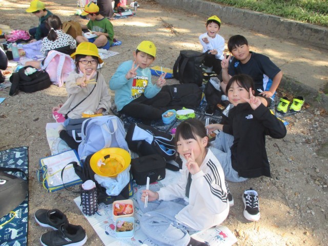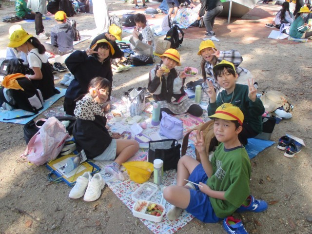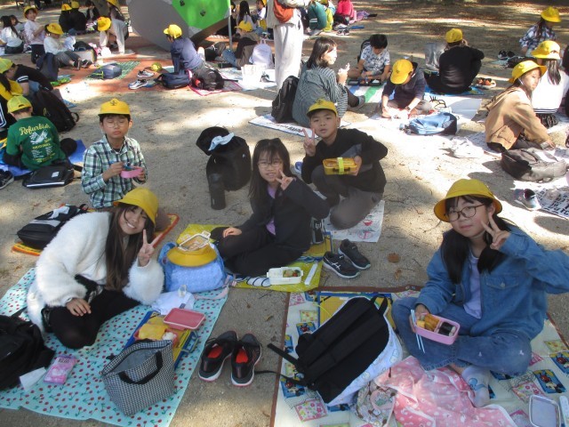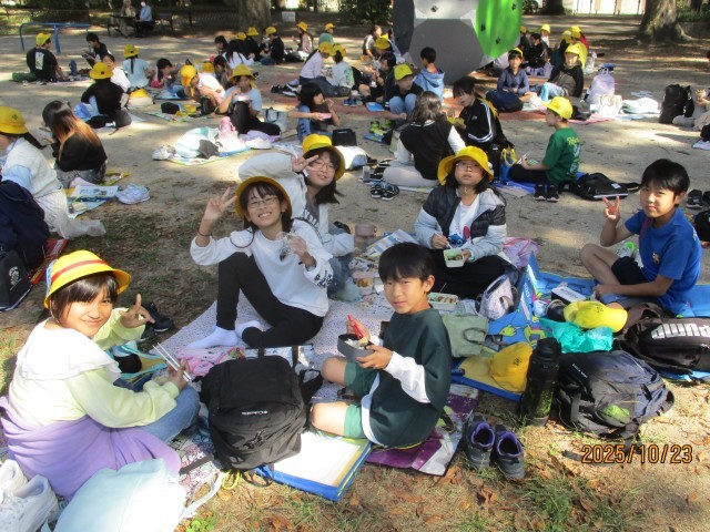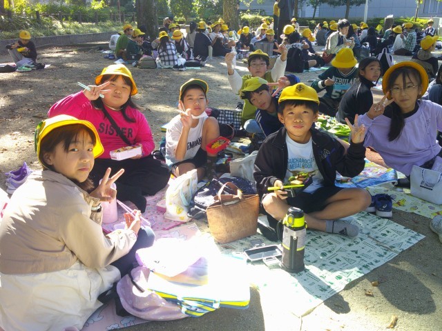 校外学習の楽しみといえば「お弁当」です。いつもの給食と違い、好きなおかずがいっぱい入ったお弁当を科学館近くの公園で食べました。この日はさわやかな晴天に恵まれ、秋の軟らかな柔らかな日差しの下、班の仲間と会話を楽しみながら味わっていました。(完)