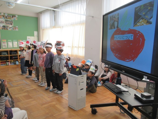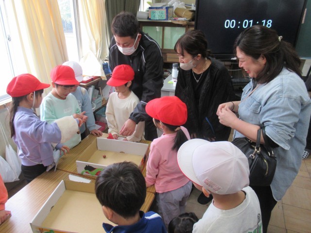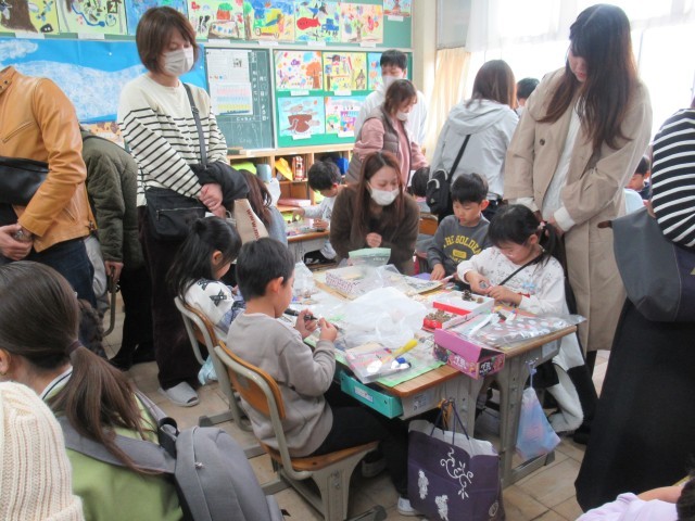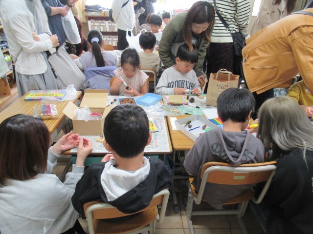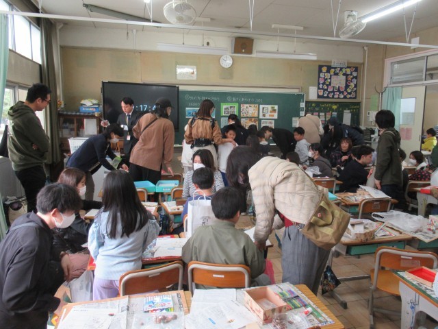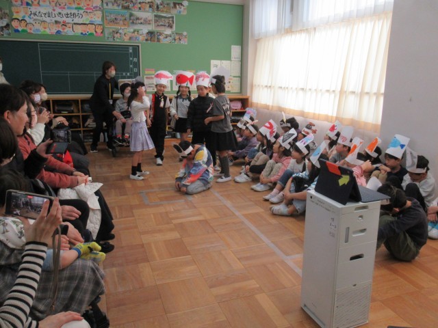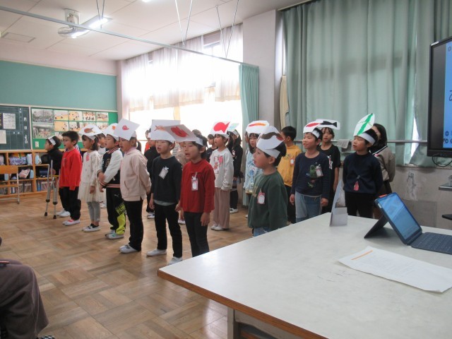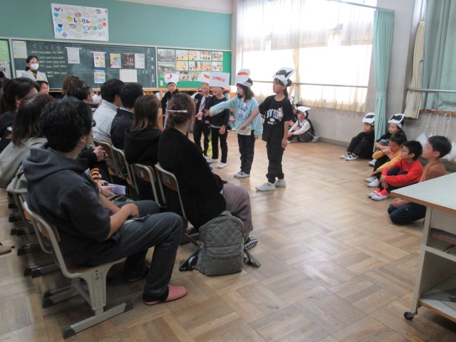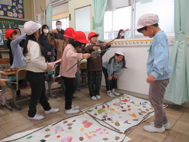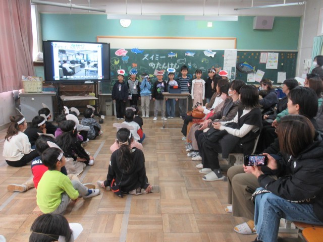 本日は授業参観が行われ、2時間目は1・2年生の授業が公開されました。1年生(写真1~5枚目)は、生活科「秋を楽しもう」をテーマに、先日の校外学習で訪ねたセレトナで見つけたどんぐりや松ぼっくりなどを材料にした工作やゲームを行いました。保護者の方も混じって一緒に楽しい時間を過ごしました。2年生(写真6~10枚目)は、生活科の授業で10月に訪ねた近隣の施設(至学館大学、共和病院、桂新堂、北山こども幸齢者交流センター)について調べたことをまとめた「町探検発表」を行いました。ただの発表ではなく、国語科「スイミー」を交えた劇や歌を交えた演出もあり、工夫を凝らした素敵な発表会でした。
