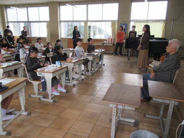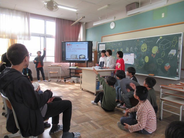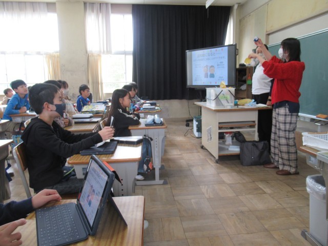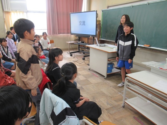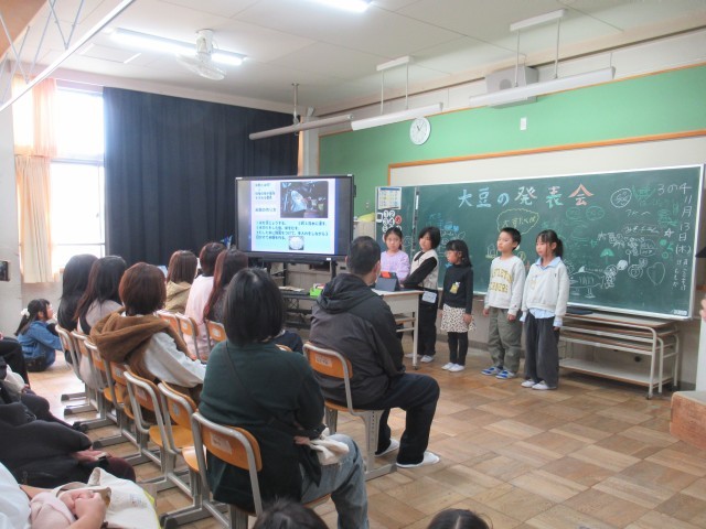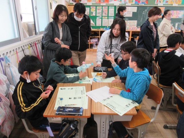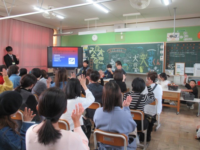 本日の授業参観は学年ごとで時間を指定して行い、3時間目は3・4年生(※4年生は4時間目も実施)の授業が公開されました。3年生(写真1~4枚目)は、総合的な学習の時間「大豆について調べたことを発表しよう」をテーマに発表を行いました。至学館大学の平田研究室の協力の下、種蒔きから収穫に至るまで大豆の生長を観察してきたことで大豆に関心をもち、大豆そのものや大豆を使った食品について調べてきたことを分かりやすく発表していました。4年生(写真5~10枚目)は、総合的な学習の時間「福祉実践教室」を開催しました。社会福祉協議会の方々による5種類の体験(手話、ガイドヘルプ、認知症、ユニバーサルデザイン、車いす体験)の中から一つを選択し、取り組みました。これまで「社会福祉」に関する調べ学習を進めてきましたが、実際の体験を通してより深い学びにつなげることができました。
