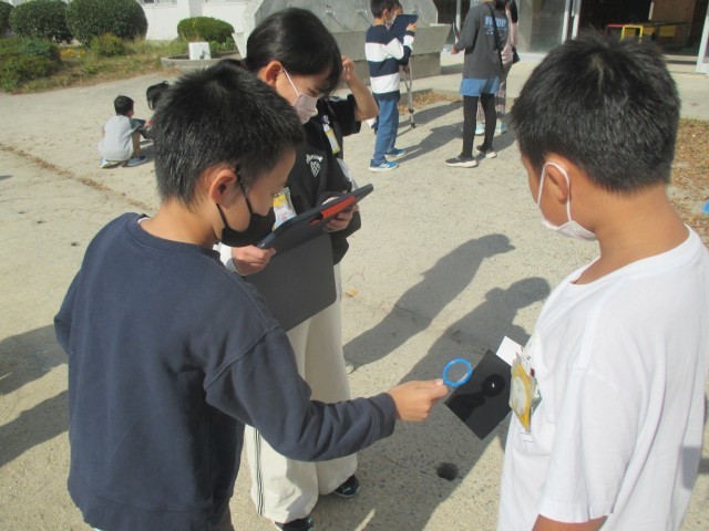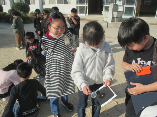 3年生の理科は「光」を学習しています。今回は、虫眼鏡を使って光を集める実験に取り組みました。太陽の光を集めて黒い紙に当てると、光のエネルギーが集まって紙からうっすらと煙が出たり、小さな穴が開いたりしました。子どもたちは、「煙が出た!」「光ってこんなに熱くなるんだ!」と目を輝かせ、光の集まり方やエネルギーの大きさに驚いた様子でした。今後の学習でも、身のまわりにある科学への興味をさらに深めていきます。