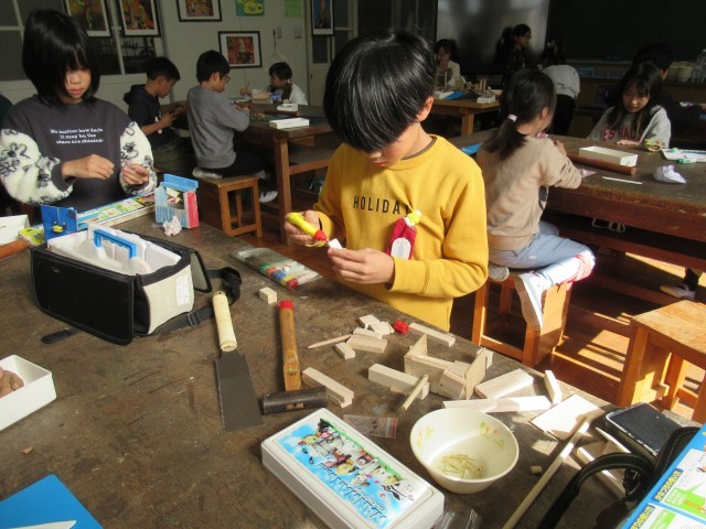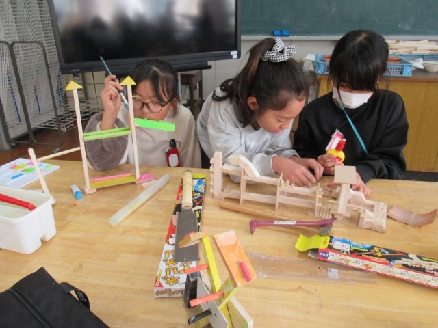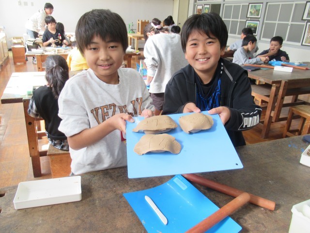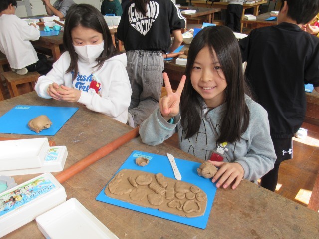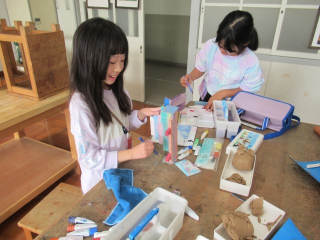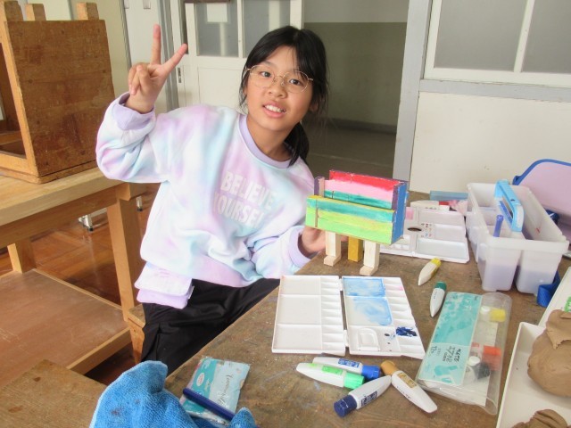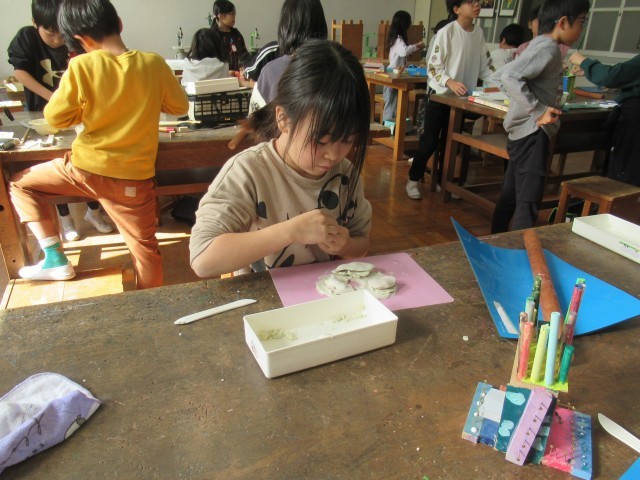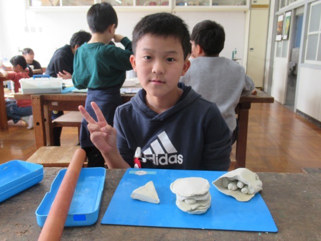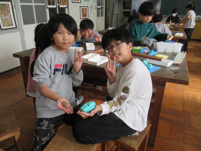 4年生の図画工作は、さまざまな形の木片をいろいろと組み合わせた立体作品の仕上げに取り組んでいました。(写真1~4枚目)ギリギリまで仕上げに取り組んでいた児童と話をしたところ、細部まで造形や彩色にこだわって制作をしている様子がうかがえました。完成した児童は、粘土を使った次の作品の制作に臨んでいました。本番は紙粘土で造形したものに絵の具で彩色しますが、今日はデザインを練るために油粘土を使って試作していました。(写真5~10枚目)何故か食べ物系(お寿司や焼き肉など)が多かったのですが、授業後に担当の先生にテーマを尋ねたところ「元気のお守り」とのことでした…食べ物がお守り?どうも「元気が出るもの=食べ物」につながったようです。その発想がユニークでおもしろいですね。