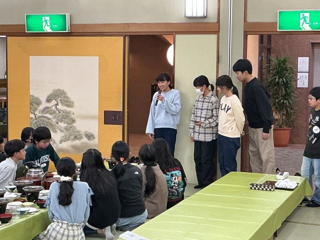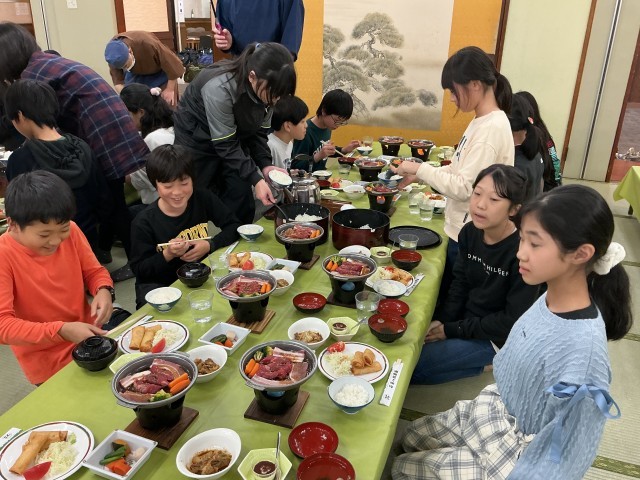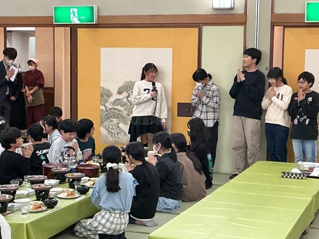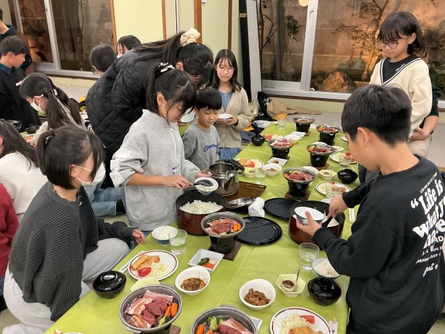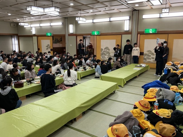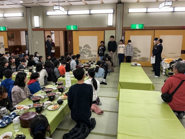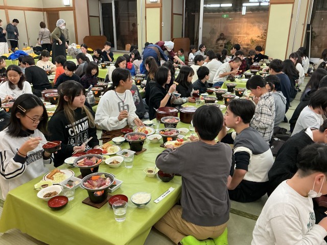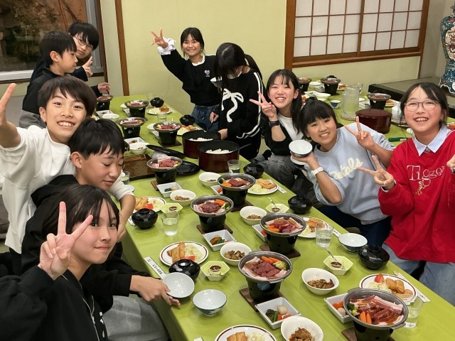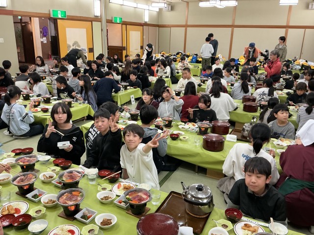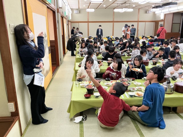 11/27(木)修学旅行1日目−10 公開日 2025/11/27 更新日 2025/11/27 6年 到着後、すぐに大広間に入り、セレモニー係によるテキパキとした進行で入館式が行われました。そしてお楽しみの夕食です。食事中は一生懸命食べていてくれるので写真撮影がしやすいしやすい。ちなみに、「いただきます」と「ごちそうさま」はクジで当たった人が担当しました。 +7 6年生