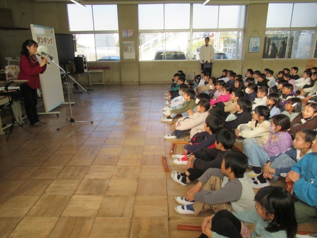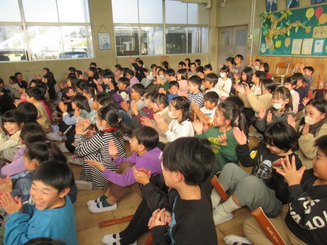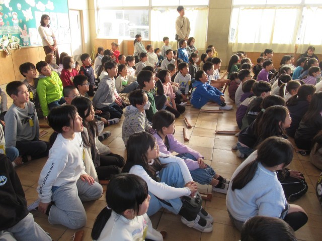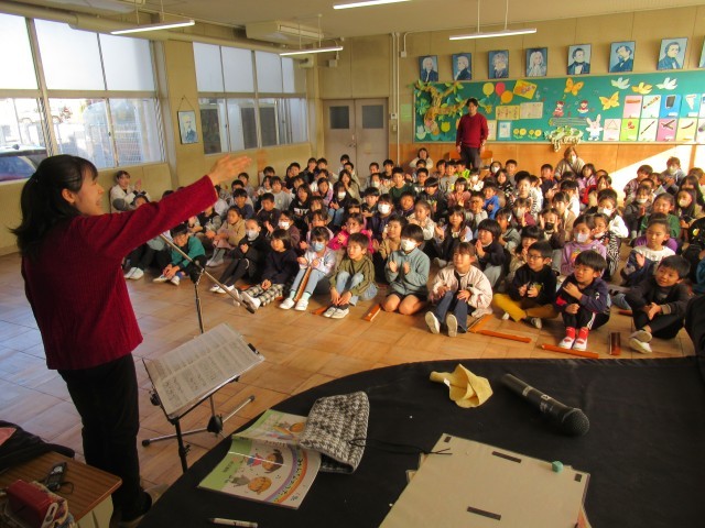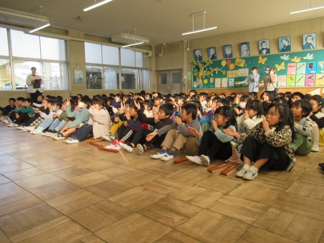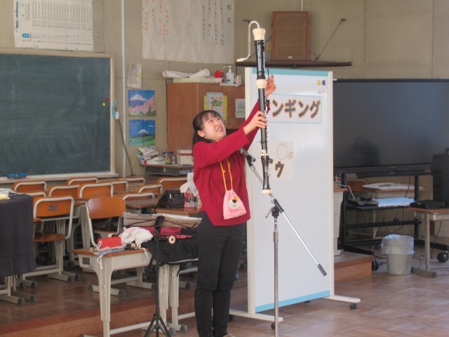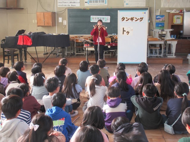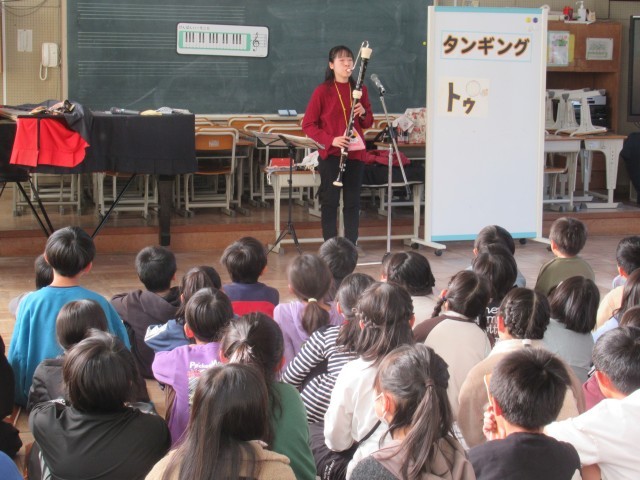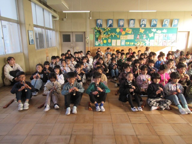 本日、3年生が講師の方をお招きし、「リコーダー教室」を行いました。初めに、リコーダーを演奏する際に大切な3つのポイントとして、「姿勢」「息の出し方」「タンギング」について分かりやすく教えていただきました。その後、リレー形式で「チューリップ」の演奏に挑戦し、学んだ3つのポイントを一つ一つ確かめながら取り組みました。(写真4、5枚目)子どもたちは、友達と音をつなぐ楽しさを味わいながら、真剣に演奏していました。後半は、音楽の授業で使用しているソプラノリコーダー以外のさまざまなリコーダーが紹介され、子どもたちはその大きさや形の違いに目を輝かせていました。(写真6~8枚目)実際にそれぞれのリコーダーを演奏していただき、音の高さや音色の違いを聴き比べる貴重な体験となりました。最後に、講師の方が2本のリコーダーを同時に演奏する特別な技を披露してくださいました。一人で2つの音を同時に出すユニークな演奏に、児童からは大きな拍手が湧き起こりました。(写真9、10枚目)今回の学びを、今後のリコーダーの学習に生かしていってほしいと思います。