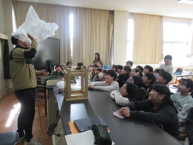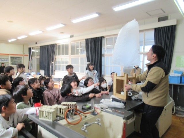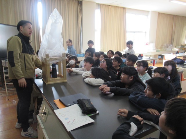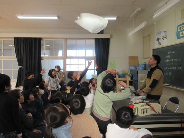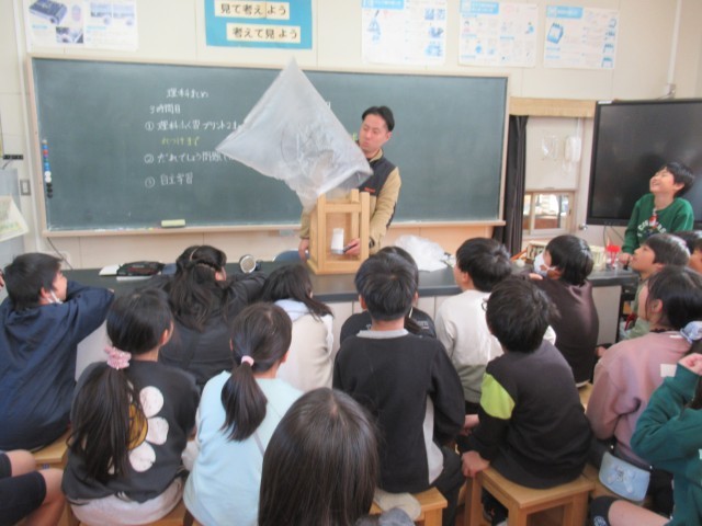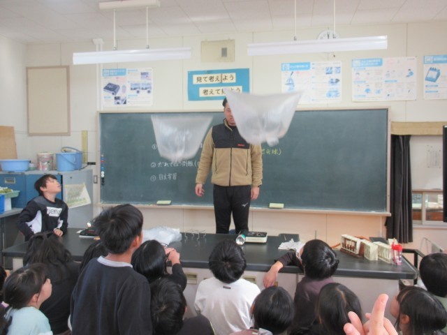 4年生の理科では、「ものの温まり方」について学習しています。12月16日(火)の学校HPでは、「水の温まり方」を調べる実験の様子をお伝えしましたが、今日は「空気の温まり方」に関する学習を行いました。授業では、先生がドライヤーやガスコンロを使って温かい空気をビニル袋に送り込みました。(写真2~7枚目)すると、袋は大きく膨らみ、天井に向かってふわりと浮かび上がりました。(写真8枚目)さらに、温かい空気を入れた袋と常温の空気を入れた袋を同時に落とすと、わずかではありますが、温かい空気の入った袋の方が落ちる速さが遅いことが分かりました。(写真9、10枚目)これらの実験から、空気は温められると軽くなることを確かめることができました。また、この性質を利用したものとして「熱気球」が紹介され、子どもたちは、目に見えない空気と温度との関係性について理解を深めることができました。今後も、身近な現象を通して科学の不思議に気付ける学習を進めていきます。