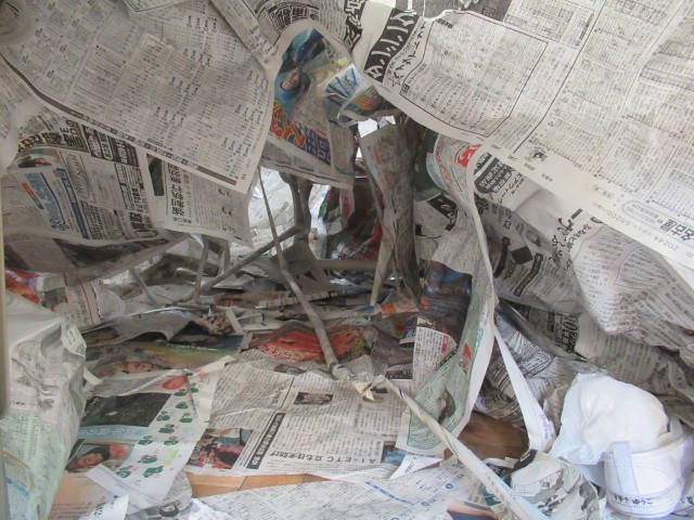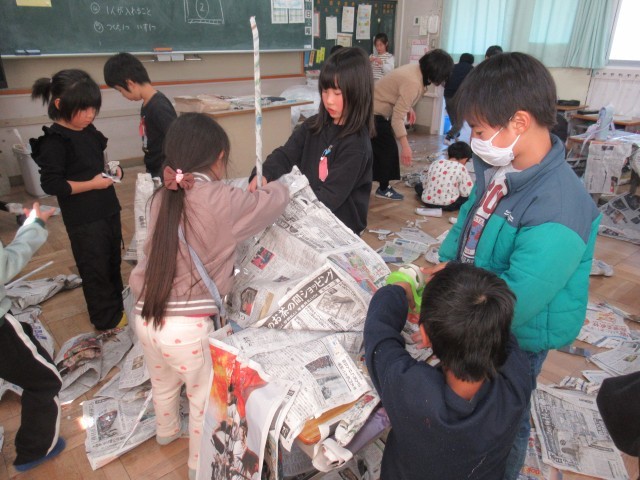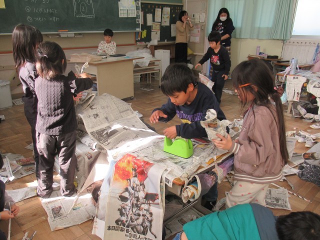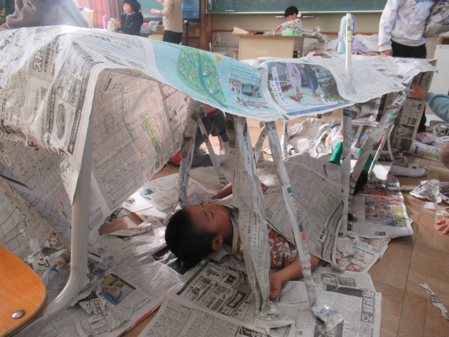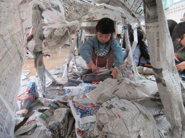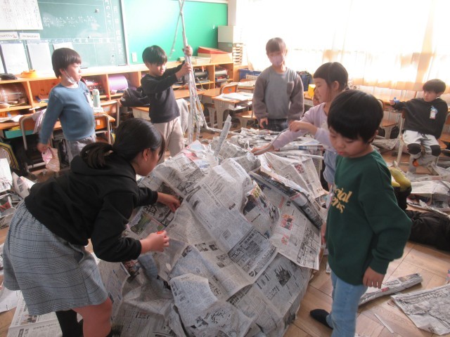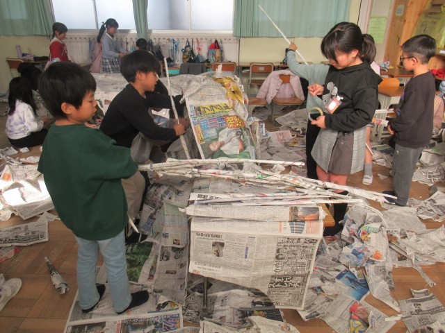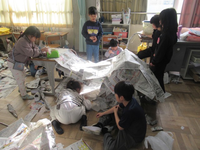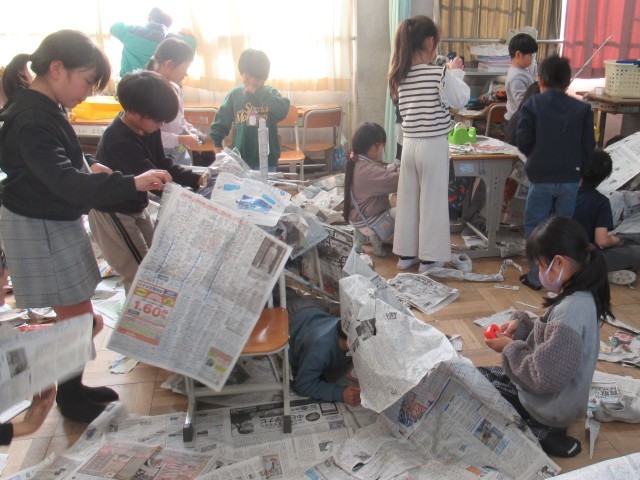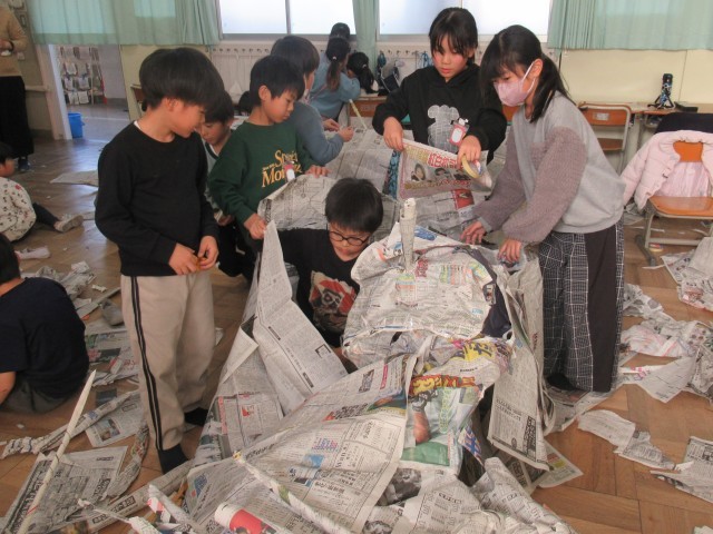 2年生の図画工作では、「新聞となかよし」をテーマに、新聞紙を使った作品づくりに取り組んできました。前回、12月12日(金)の授業では「かぶり物」を製作し、発表会を行いましたが、今回は予告されていた「秘密基地」づくりに挑戦しました。3つのグループに分かれ、それぞれが工夫を凝らした「秘密基地」を製作しました。新聞紙を切ったり、折ったり、つなぎ合わせたりと、さまざまな作業を分担しながら協力して取り組み、教室は新聞紙でいっぱいになりました。完成した「秘密基地」には、実際に中に入ることができるスペースもあり、中に入って楽しそうに過ごす児童もいました。(写真9、10枚目)グループ間で発想の違いが表れ、工夫とアイデアがつまった作品になりました。