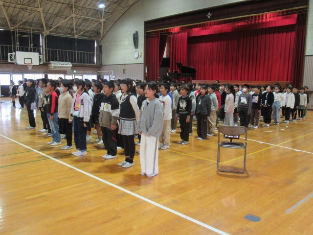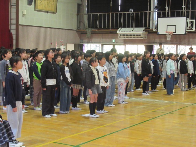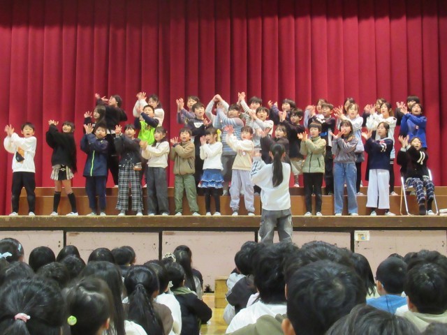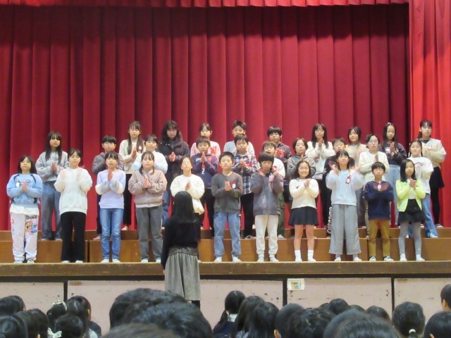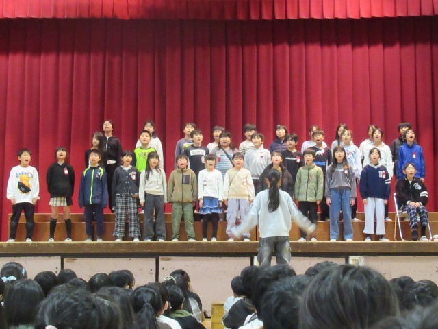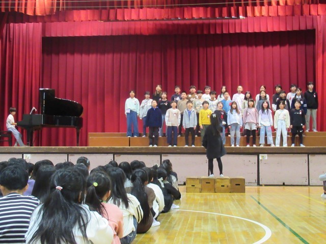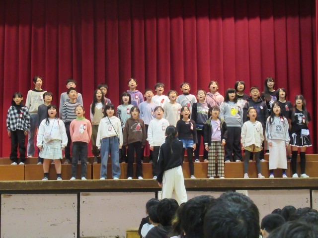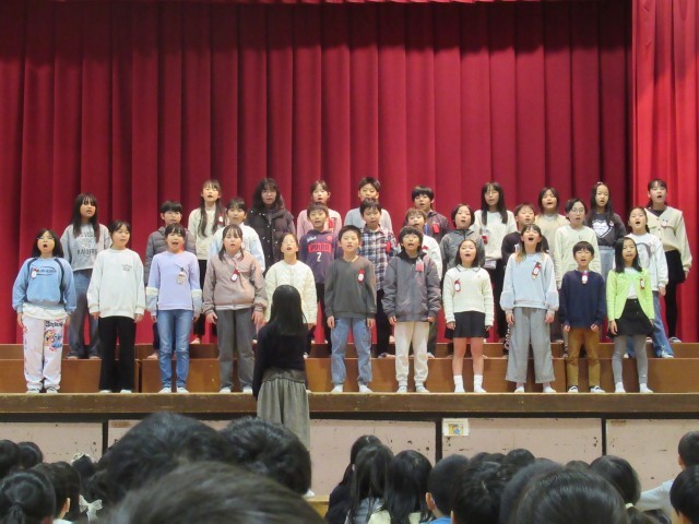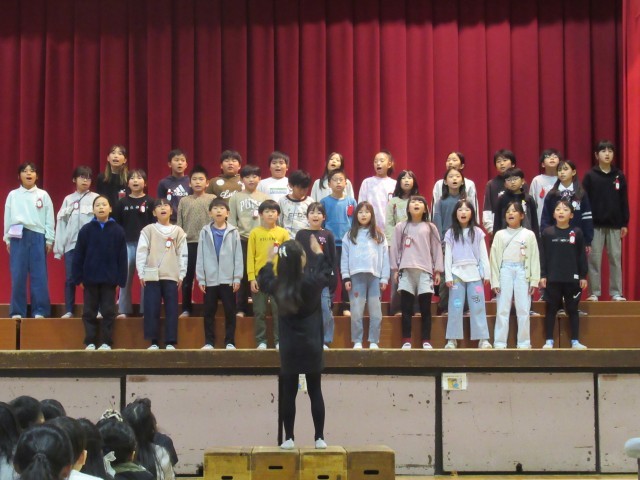 4年生の合唱発表会は、今年も3年生と保護者の方をお迎えして行いました。合唱発表では、最初にクラス紹介があり、代表児童から普段の学級の様子や合唱発表会に向けた意気込みが語られました。その後の合唱発表は、どの学級も精一杯声を響かせようと大きく口を開いて歌う姿が印象的でした。最後は、3年生と合同で「みつけよう大切なもの」を全員合唱し、会場内に元気な歌声を響かせていました。(写真9、10枚目)