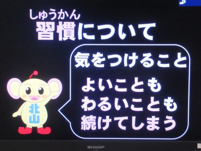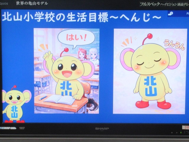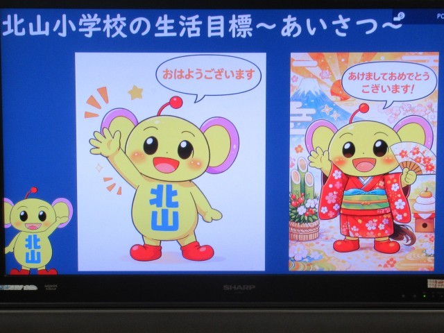 始業式後、生徒指導担当の先生から「3学期の生活」に関するお話がありました。北山小学校の生活目標である「あいさつ」「へんじ」「あとしまつ」について、マスコットキャラクターの「きたちゃん」をモチーフにしたかわいらしいイラストを例にして大切にしたい心構えが具体的に紹介されました。(写真7~10枚目)この3つの生活目標を意識して、今年も「いいこと考えた!やってみよう!」に取り組んでいってほしいと思います。